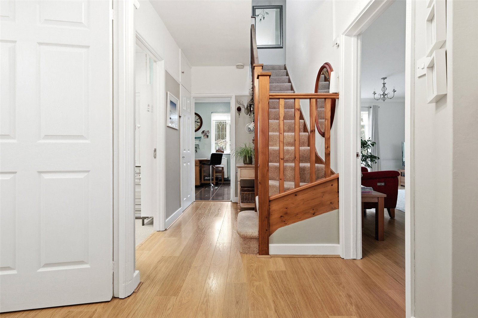 UPVC double glazed leaded light window to side with fitted plantation shutter. Doors lead off to ground floor rooms. Stairs rising to first floor accommodation. Storage cupboard to side. Understairs storage cupboard. Wall mounted radiator. Wood effect laminate flooring. Feature picture rail. Smooth plastered ceiling.