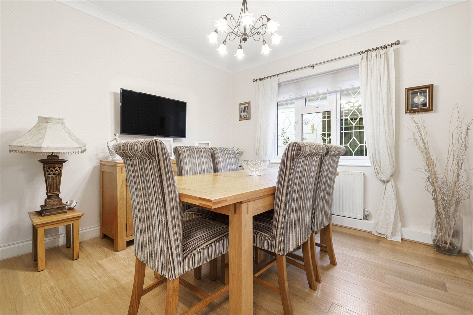 UPVC triple glazed leaded light window to side. Wall mounted radiator. Wood effect laminate flooring. Coved cornice to smooth plastered ceiling.