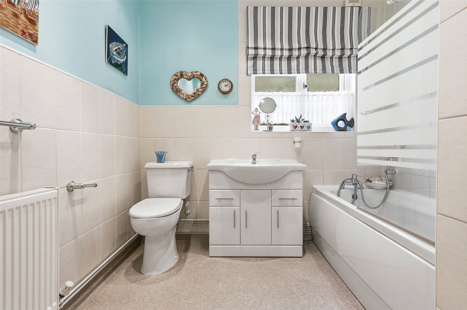 UPVC double obscured glazed window to side. Fitted with a modern three piece suite comprising low flush WC, wash basin with mixer tap and storage cupboards and drawers beneath and panelled bath with mixer tap plus detachable showerhead. further wall mounted shower with adjustable showerhead and glass shower screen. Wall mounted radiator. Non slip vinyl flooring. Part tiled walls. Utility cupboard to side with space and plumbing for washing machine. Smooth plastered ceiling with recessed LED lighting. Wall mounted extractor fan.