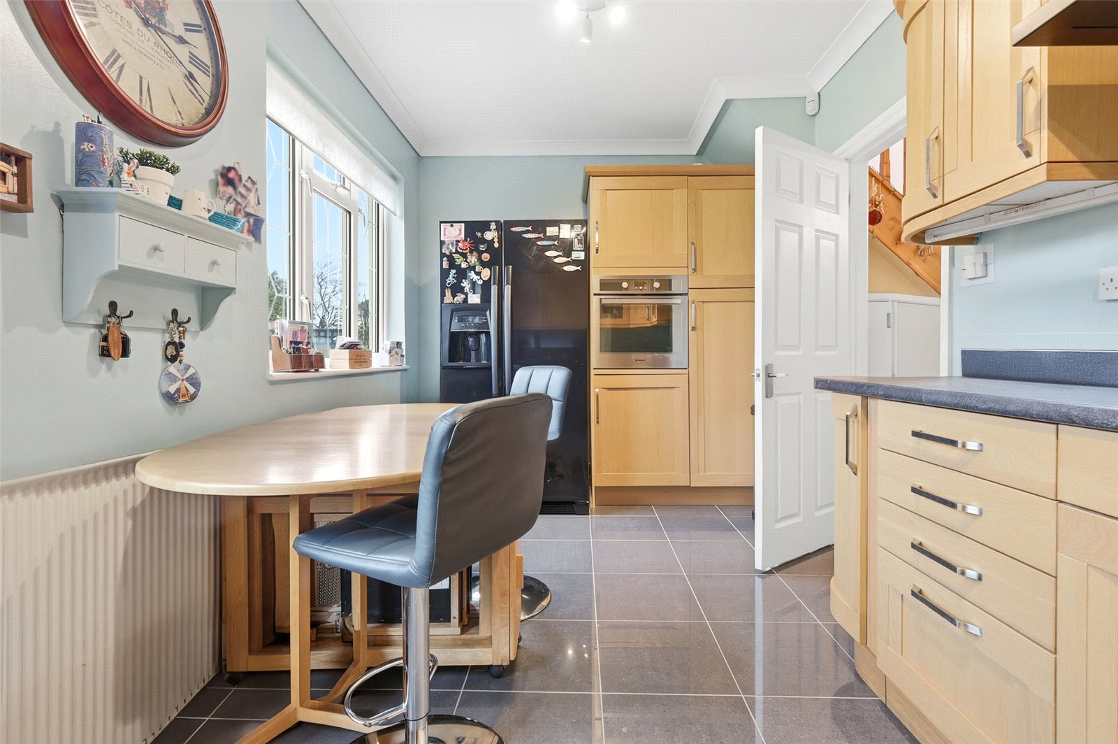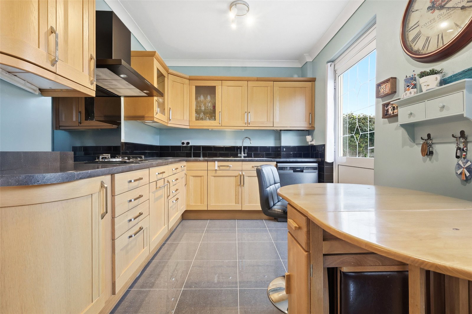 Double glazed door to rear leading to rear garden. Double glazed leaded light window to rear overlooking rear garden. Kitchen is fitted with an extensive range of base and eye level Oak fronted base and shaker style cabinets incorporating a rolled edge working surface. Inset one and a half bowl stainless steel sink with mixer tap and drainer unit. Inset five burner gas hob with canopied extractor hood above. Integrated electric fan assist oven. Space and plumbing for dishwasher. Space for American style fridge/freezer. Tiled splashbacks. Fully tiled floors. Wall mounted radiator. Coved cornice to smooth plastered ceiling.