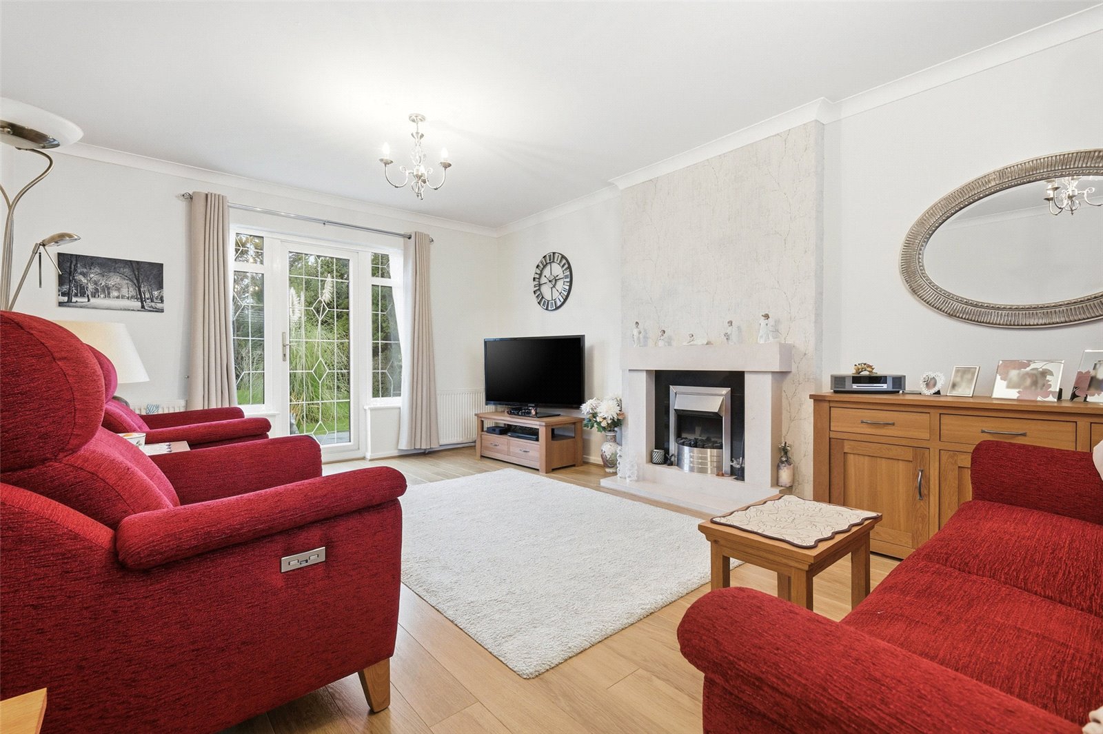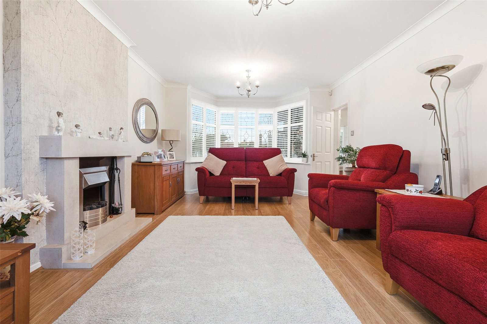Large UPVC triple glazed leaded light bay window unit to front with fitted plantation shutters. UPVC double glazed door to rear leading on to rear garden with matching windows adjacent. Feature fireplace with stone mantle and hearth, inset electric fire. Three wall mounted radiators. Wood effect laminate flooring. High level skirting. Coved cornice to smooth plastered ceiling.