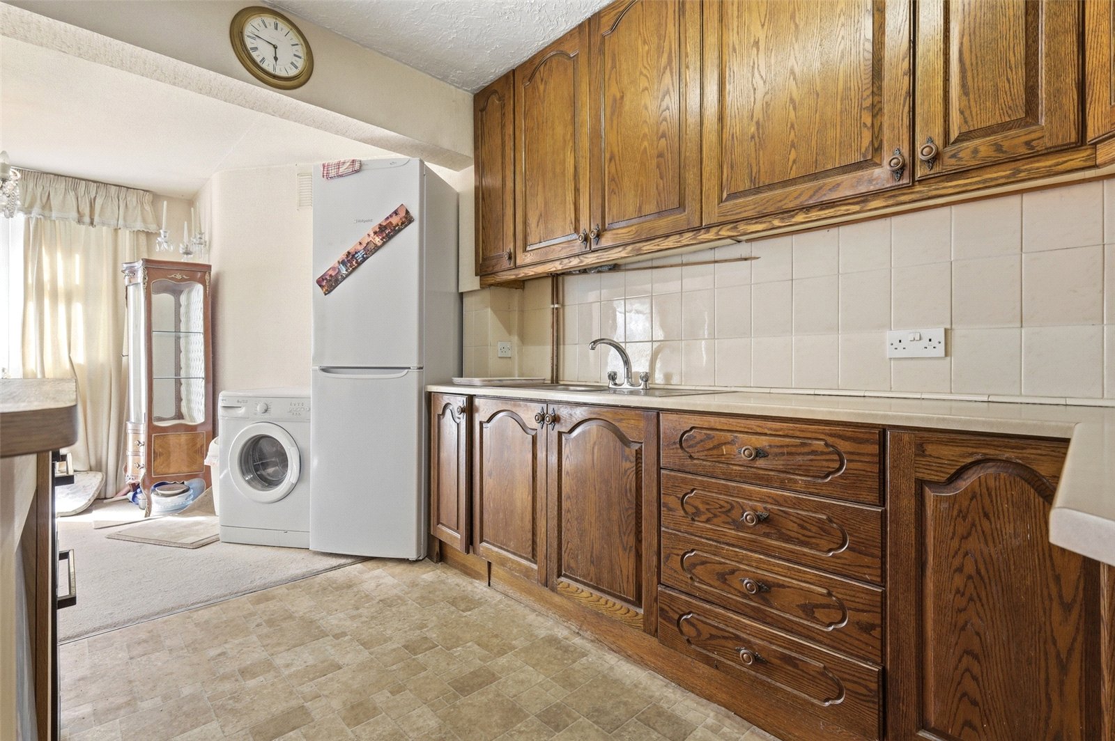 Fitted with a range of wooden fronted base and eye level cabinets incorporating a rolled edge working surface. Inset one and a half bowl stainless steel sink with mixer tap and drainer unit. Space for freestanding oven. Storage cupboard to side. Space and plumbing for washing machine. Space for fridge/freezer. Tiled splashbacks. Tile effect vinyl flooring. Wide opening to rear opening to the;