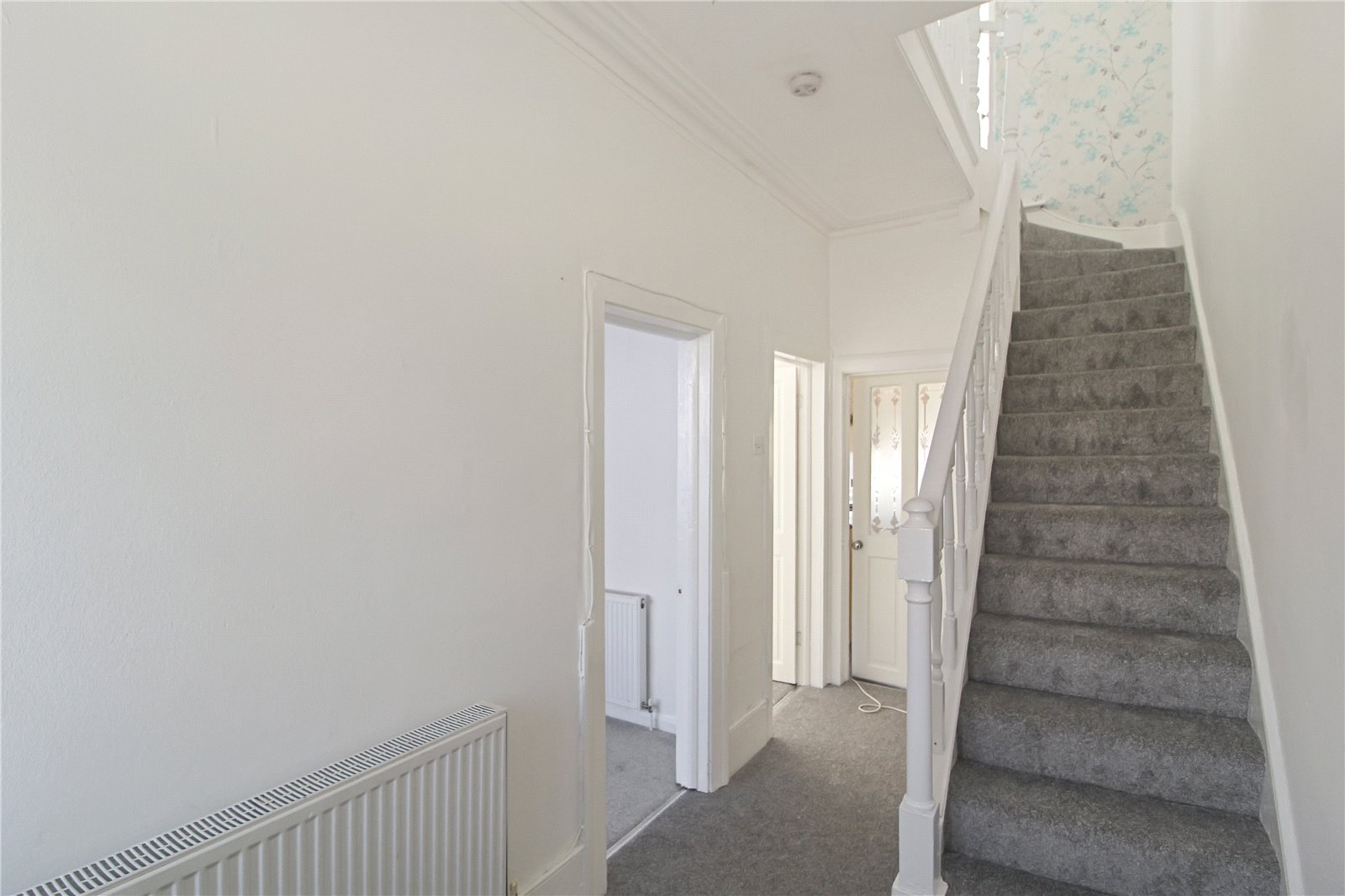 Carpet to floor, smooth ceiling, ceiling light, radiator, stairs to first floor, understairs storage and doors to all ground floor rooms.