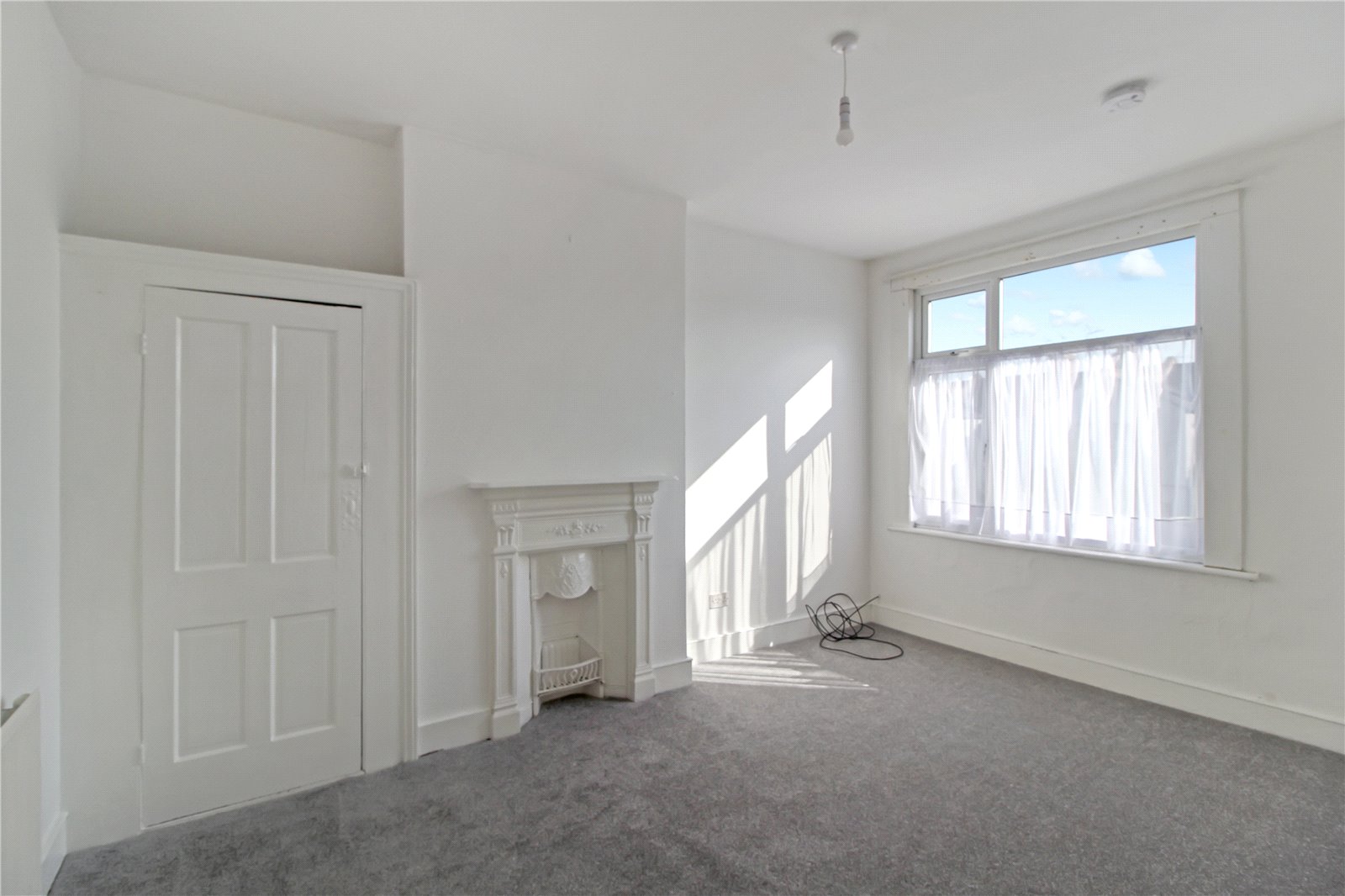 Carpet to floor, smooth ceiling, ceiling light, fireplace, radiator, fitted cupboard, double glazed window to rear.