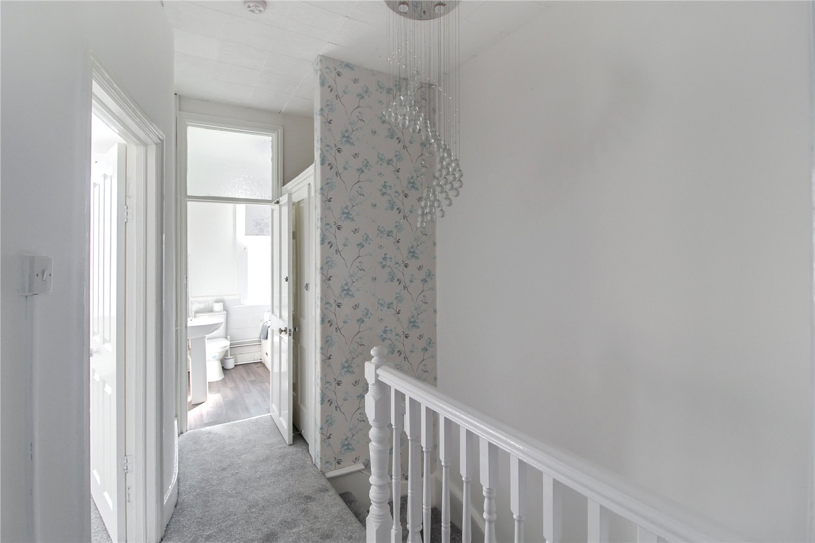 First floor landing with carpet to floor, ceiling light, storage cupboard and doors to all first-floor rooms.