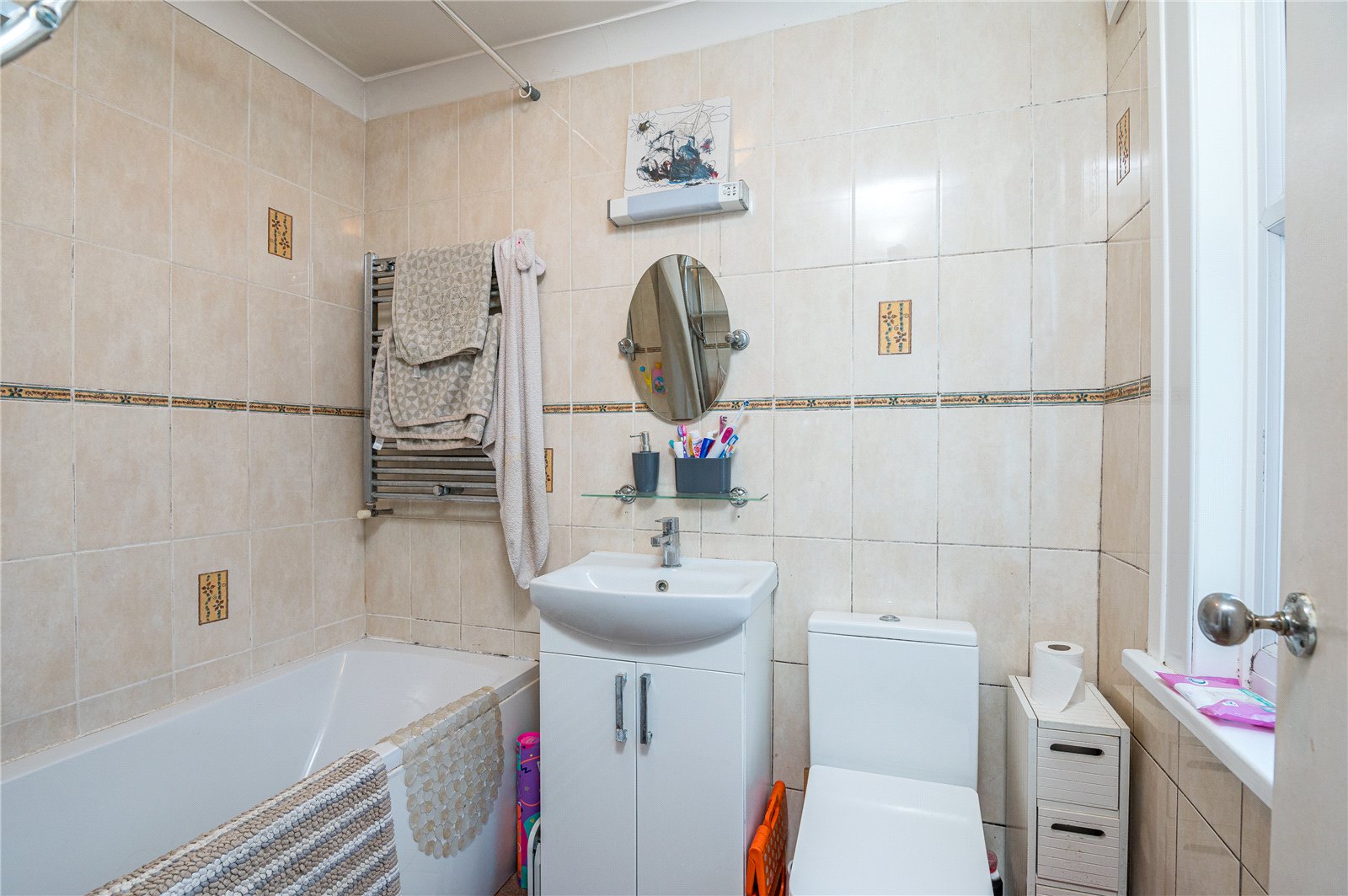 Obscure uPVC double glazed window to side. A fully tiled room fitted with a three piece suite comprising panel enclosed bath with mixer tap and shower attachment, vanity wash hand basin with contemporary mixer tap, and dual-flush close coupled WC. Wall light point. Extractor fan. Drop light switch. Coved cornice to smooth plastered ceiling.