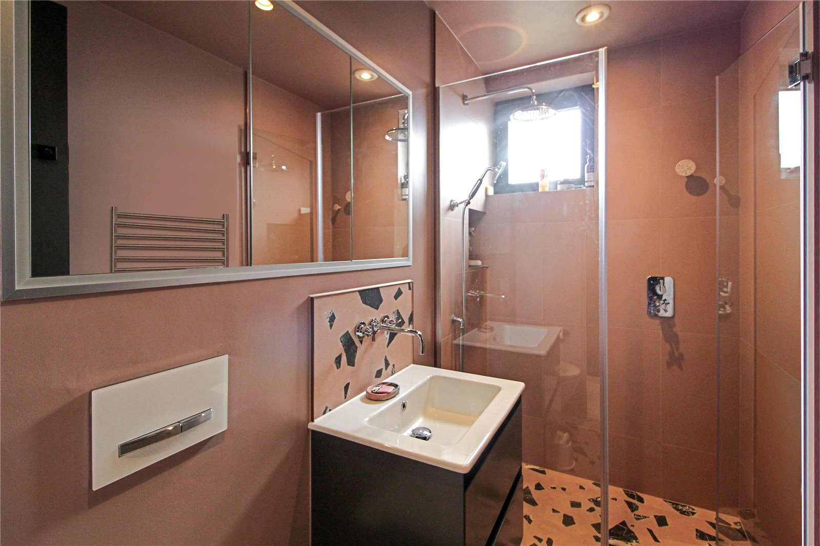 Double glazed obscure window to side. Fitted with a beautiful three-piece suite comprising Boutique Stone porcelain tiled walk-in shower with Burlington shower fittings, recessed shelf and shower screen. Wash basin with chrome Burlington mixer tap set within Saneux vanity unit, HIB Vanquish recessed mirrored vanity cabinet above with integrated lighting and internal power points and low-level Duravitt wall-hanging w.c. with soft-close seat and concealed gerberit system. Tiled floor with underfloor heating. Heated towel rail. Remaining walls are smooth plastered with smooth plastered ceiling, recessed LED spotlights and extractor light.