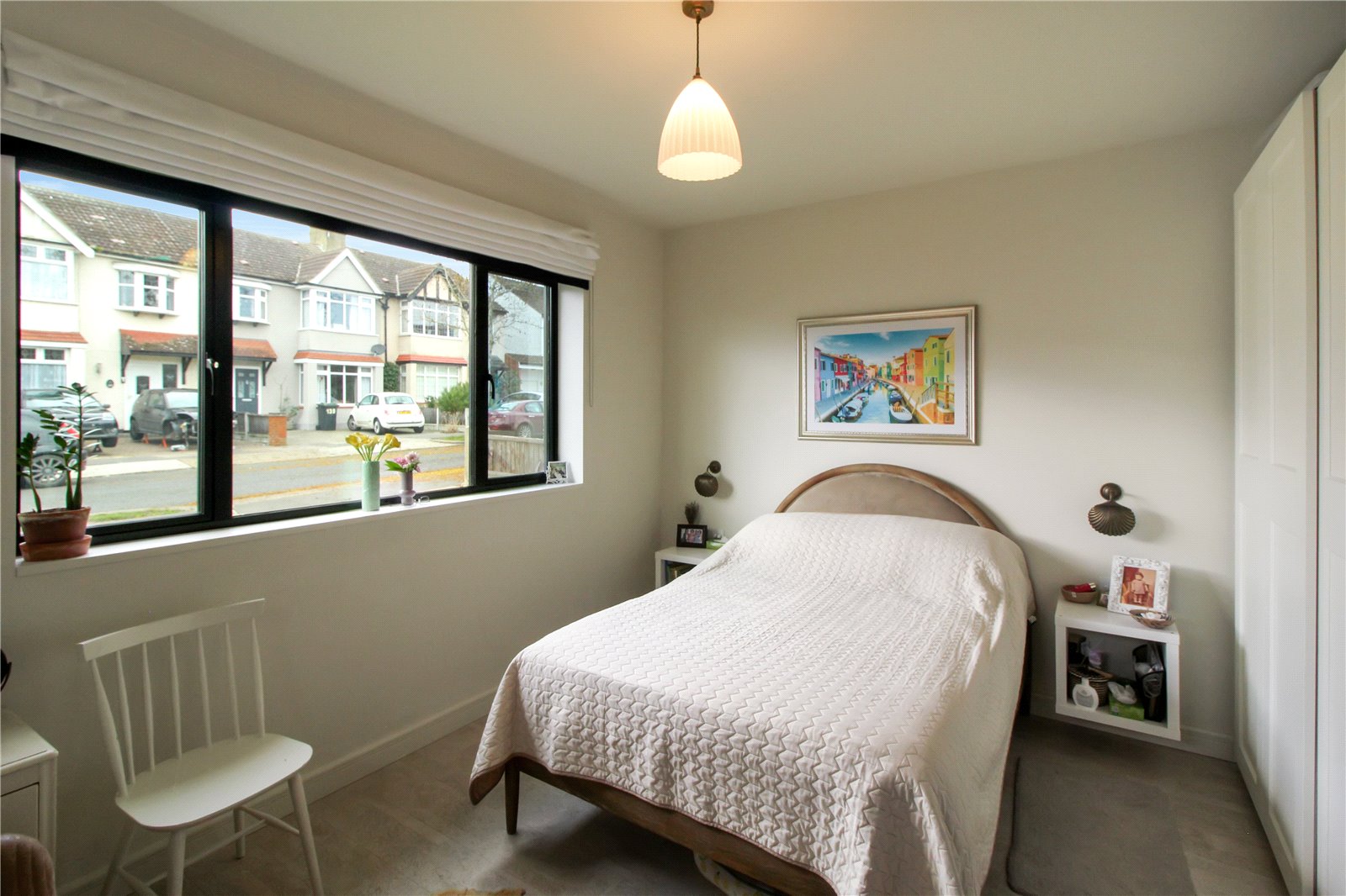 Double glazed window to front with and feature stained glass window to side. Cork flooring with underfloor heating. Skirting. Two bedside wall lights. Smooth plastered walls and smooth plastered ceiling with ceiling light.