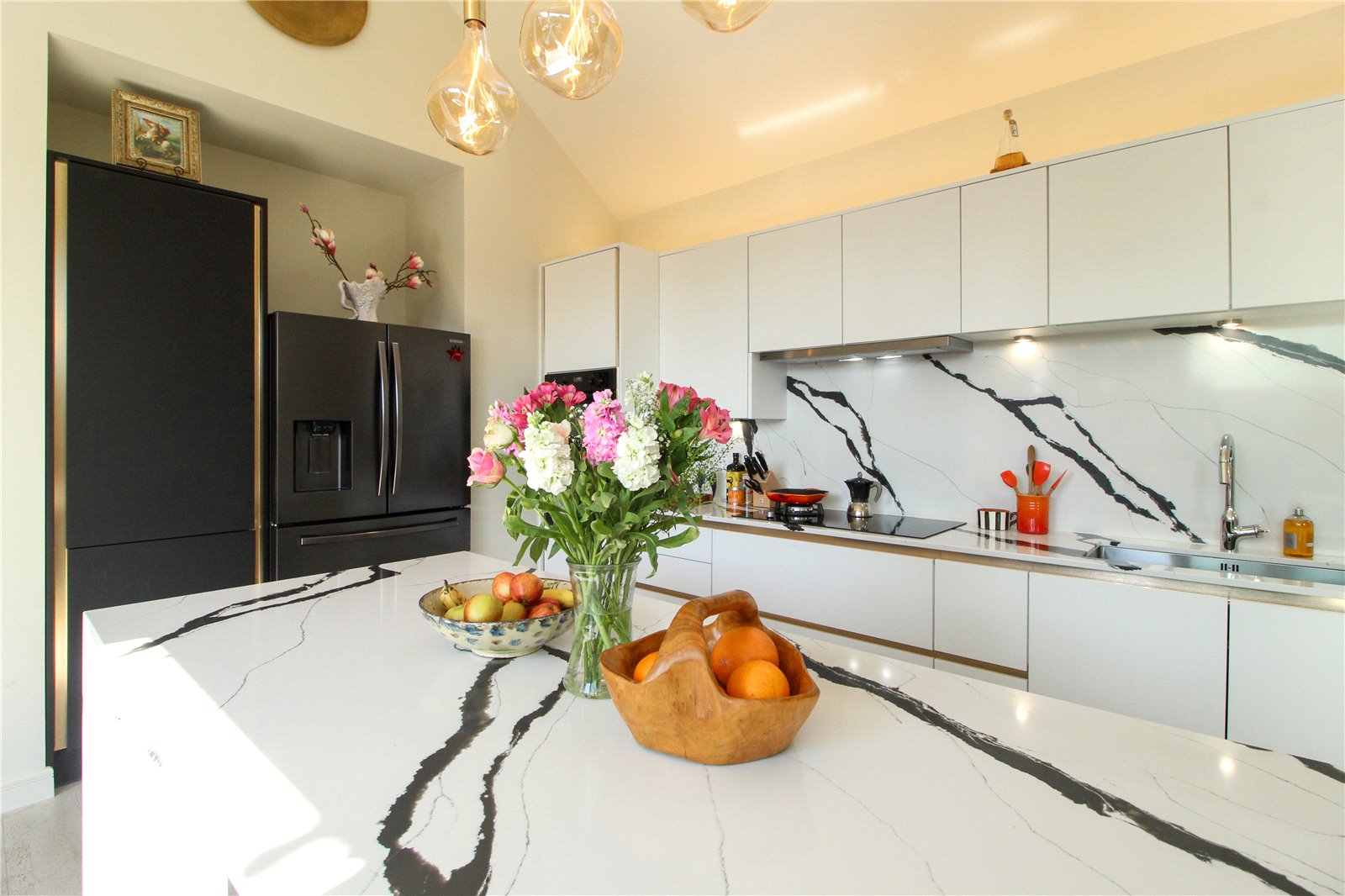 The kitchen is fitted with a quartz worksurface and matching splashback, comprising of double-width inset stainless-steel sink with hands free chrome monobloc tap, induction hob (with gas capability) and a comprehensive range of base and eye-level cabinets with gold accents housing wall-mounted, eye-level double oven and an integrated smart dishwasher. A kitchen island fitted with a Quartz worksurface with cabinets and draws in matte black finish with gold accents, doubles up as a breakfast bar. The kitchen has space for an American-style Fridge/Freezer, has wall light points, smooth plastered walls and a smooth plastered ceiling. Suspended lighting. Suspended ceiling light pendant. Recessed LED spotlights. Smoke alarm. Vaulted ceiling. Opening to 'The Pantry' / Second Utility.