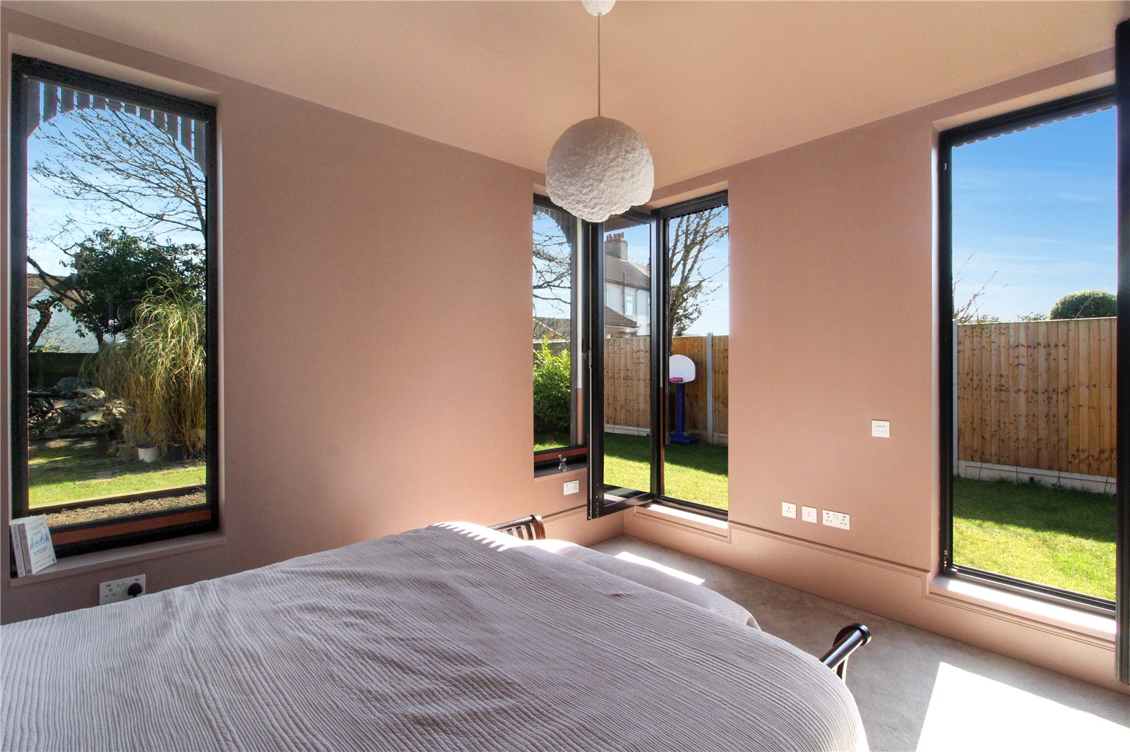 Dual aspect room with two double glazed full-height 'tilt-and-turn windows' to side with integrated blinds and two double glazed windows to rear with integrated blinds. Cork flooring with underfloor heating. Bedside wall light and bedside wall light point. Smooth plastered walls and smooth plastered ceiling with feature ceiling light. Door to En suite.