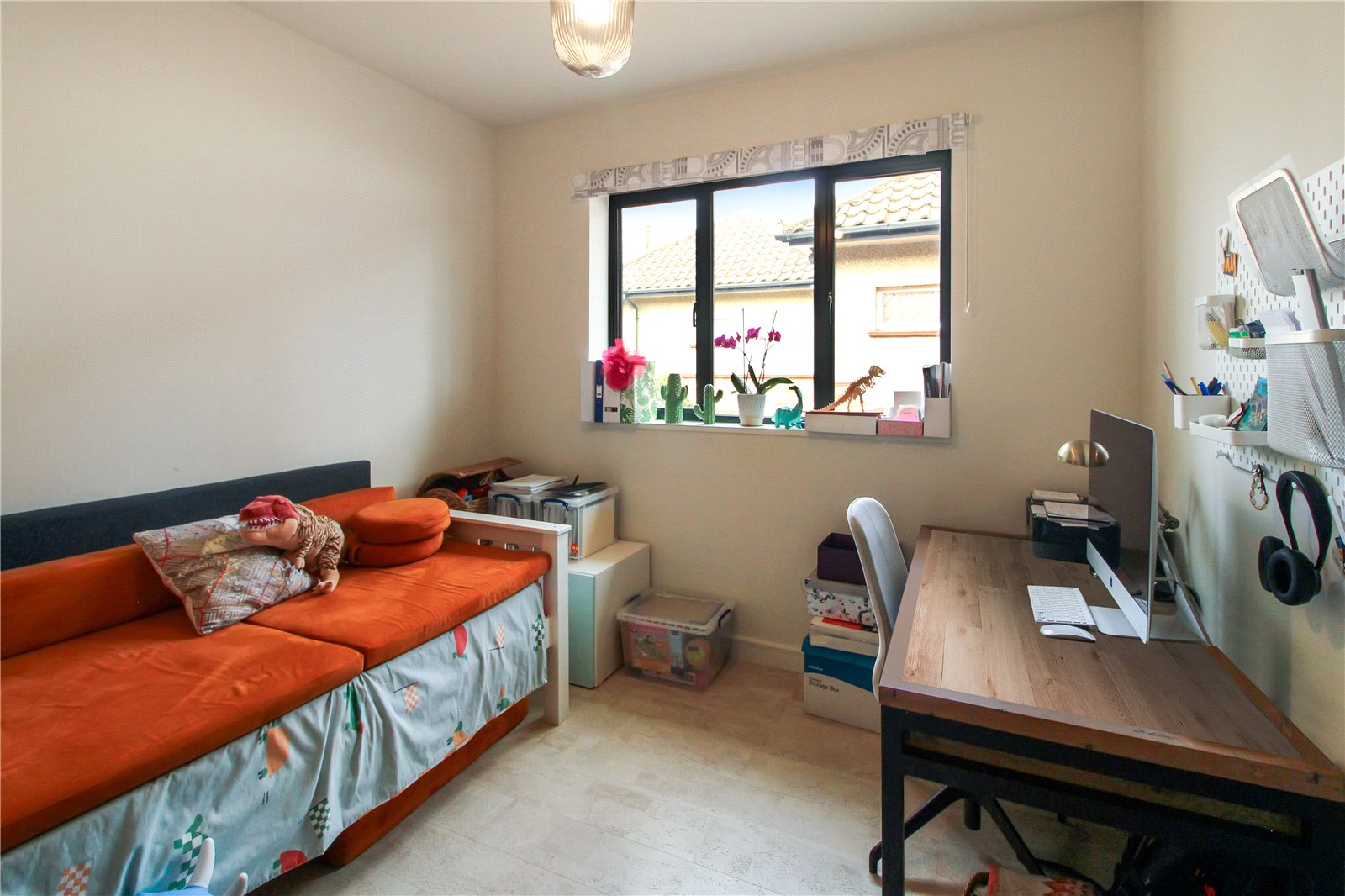 Double glazed window to front. 'Heatmiser' app-enabled thermostat control for zoned underfloor heating. Cork flooring with underfloor heating. Skirting. Smooth plastered walls. Wall light. Smooth plastered ceiling with ceiling light pendant.