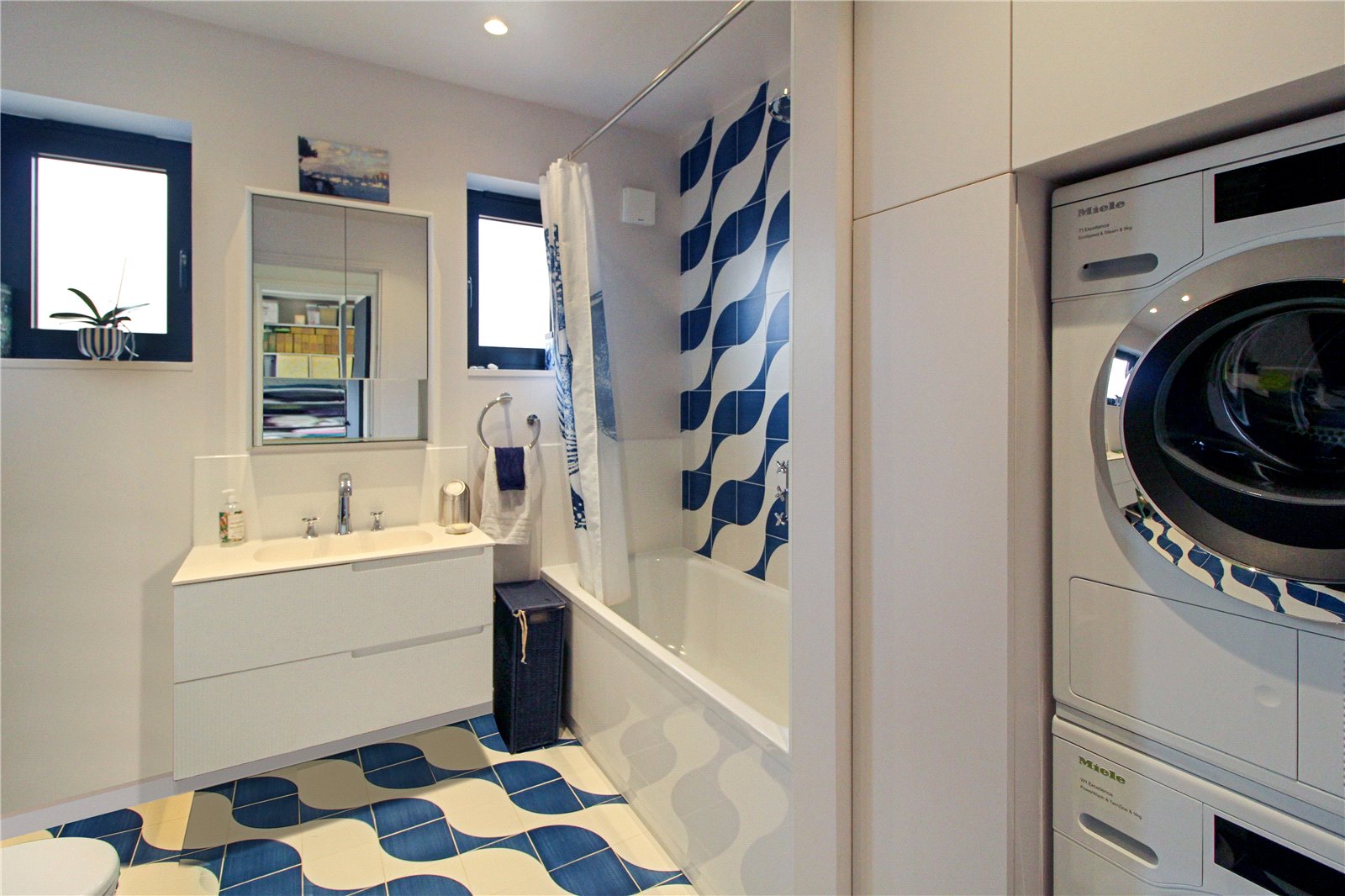 Two double glazed obscure windows to side. Fitted with a fantastic three-piece contemporary white suite comprising panel enclosed Betteocean bath with integrated Riviera overflow bath filler and wall-mounted overhead and handheld Bulington shower attachments with recessed shelf. Fiora synergy wall-mounted vanity sink cabinet with chrome Cifial mixer tap, wall-mounted HIB Verve vanity cabinet above with integrated lighting and internal power points and Duravitt low-level w.c. Mandarin stone floor, with underfloor heating. Heated towel rail. Wall-mounted corner shelving unit. Floor to ceiling fitted storage cupboard with space for washing machine and washer-dryer adjacent. Wall tiling to bath and shower area. Extractor. Remaining walls are smooth plastered with a smooth plastered ceiling and recessed LED spotlight.