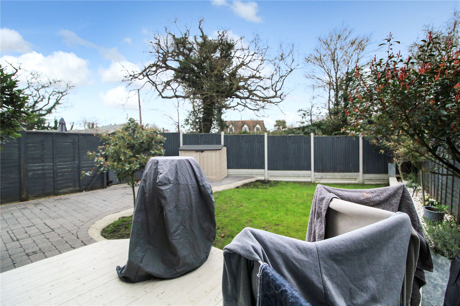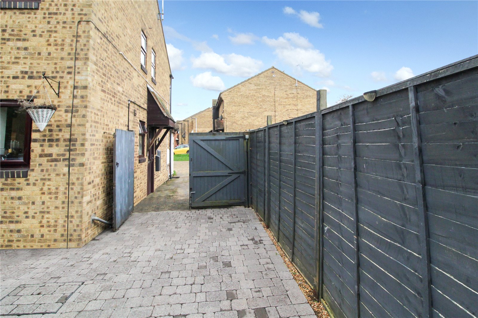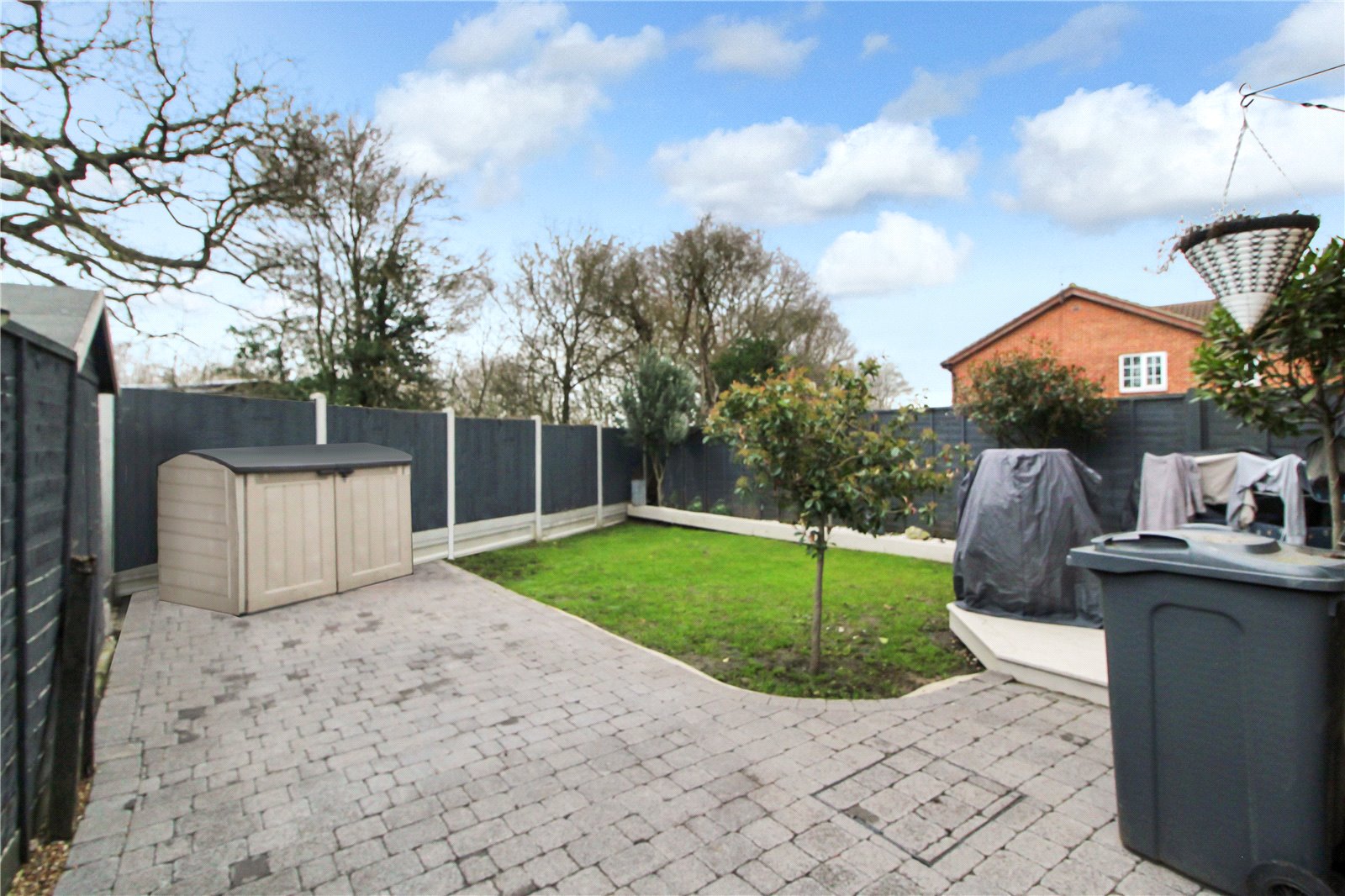 Good size rear garden backing onto woods commencing with paved area, then laid to lawn, access via side gate or living room, 2 x sheds.