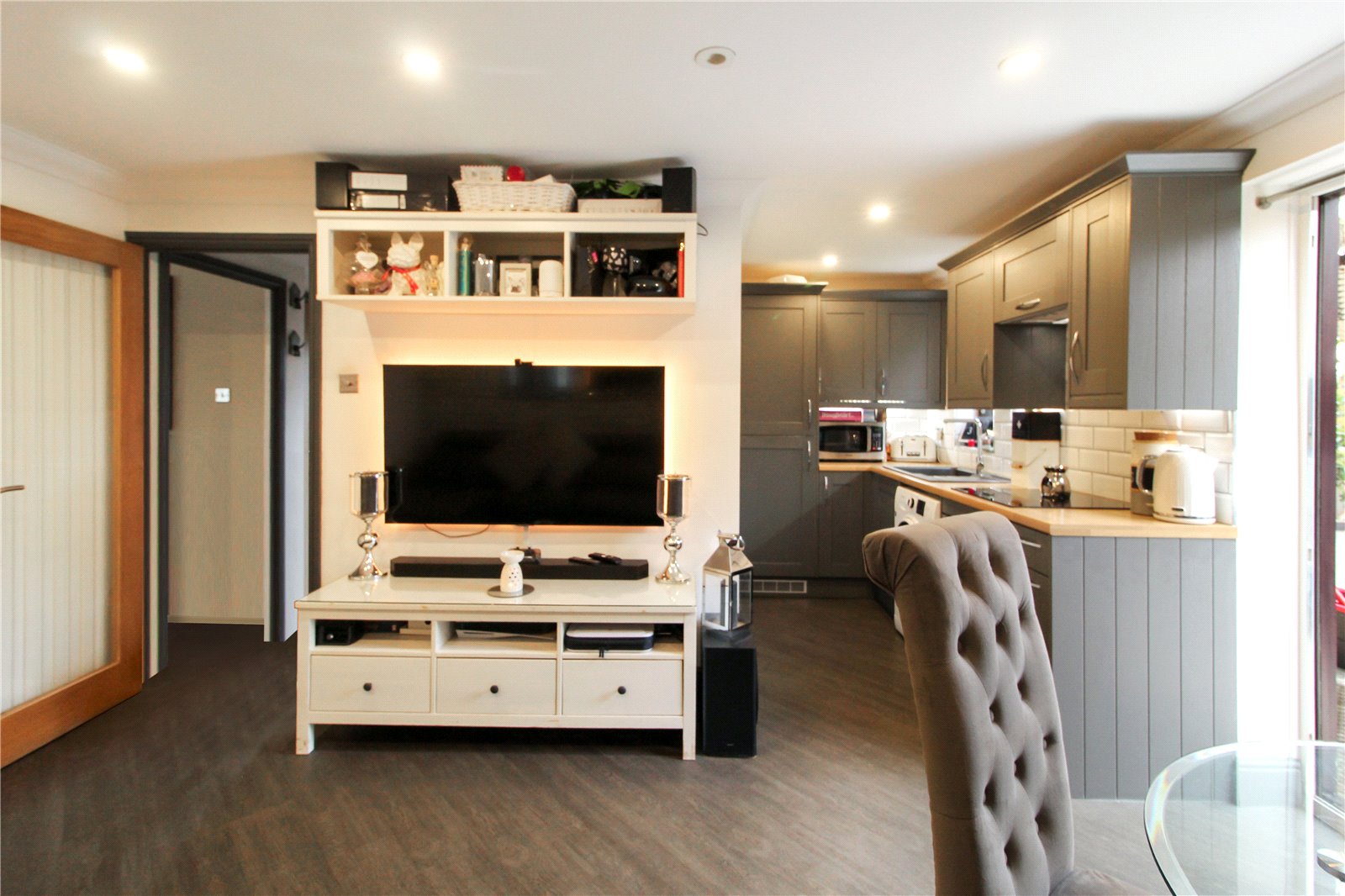 Kitchen area has a range of eye and base level units, sink with drainer unit, oven and hob, fitted fridge/freezer, space for washing machine.
