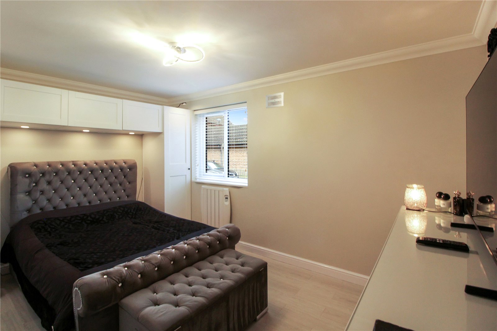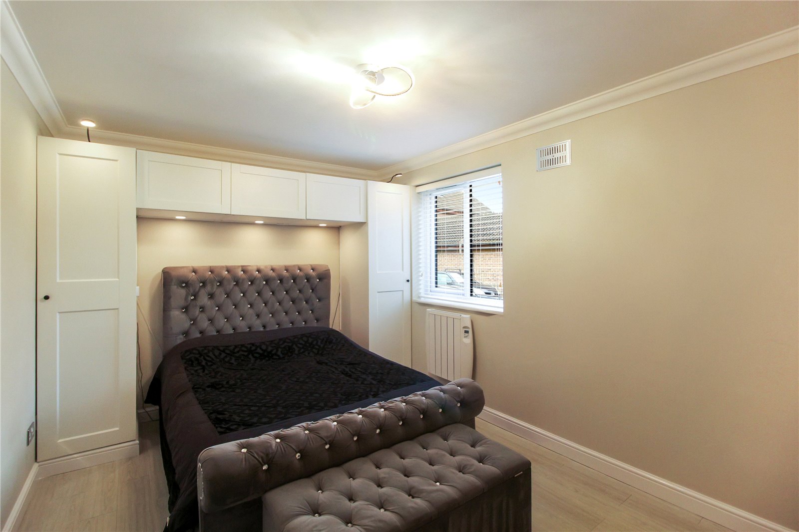 Wooden floor, smooth ceiling, ceiling light, radiator, fitted wardrobes and storage to one wall with spotlights fitted in, double glazed window to front.