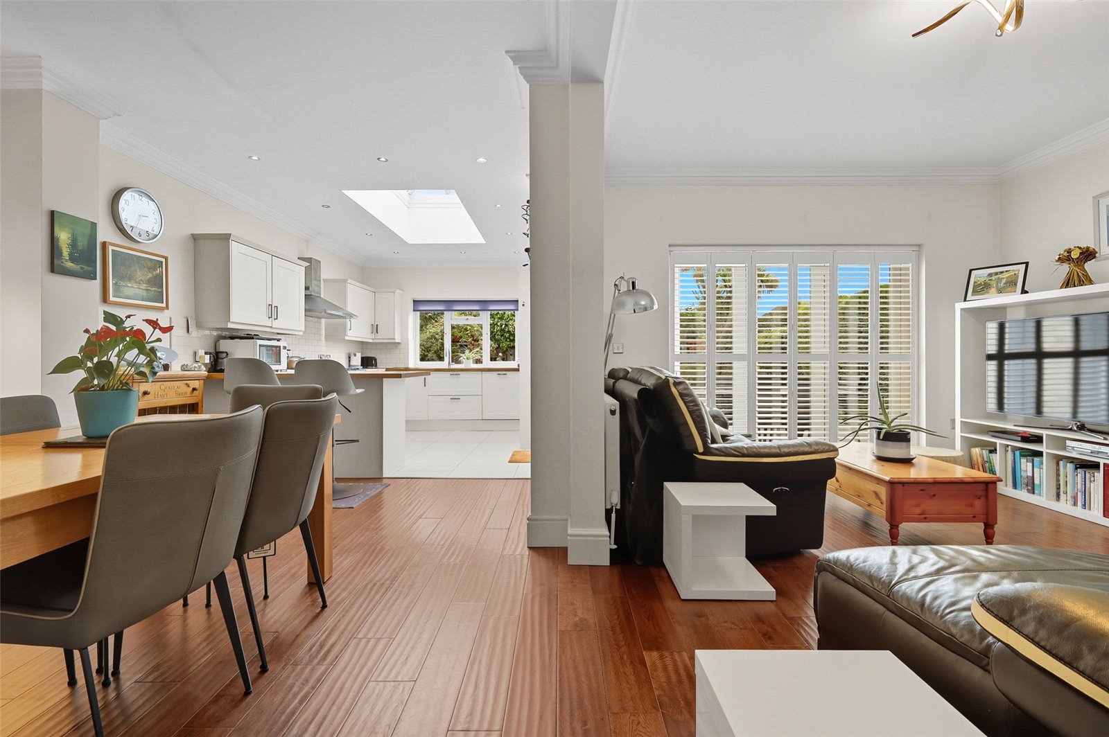 The family room/kitchen/dining combine to create a wonderful open plan living area which connects seamlessly to established rear garden.