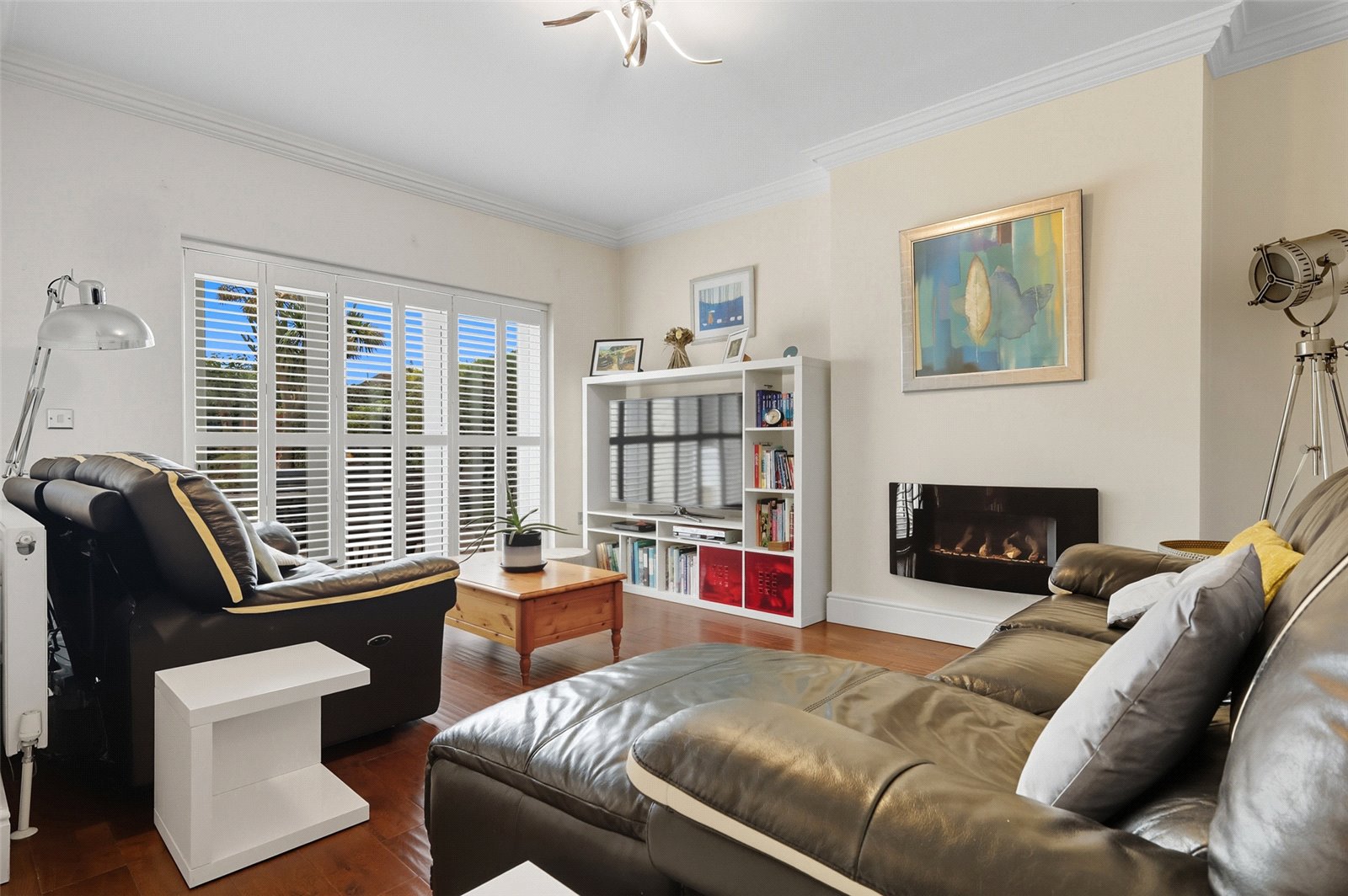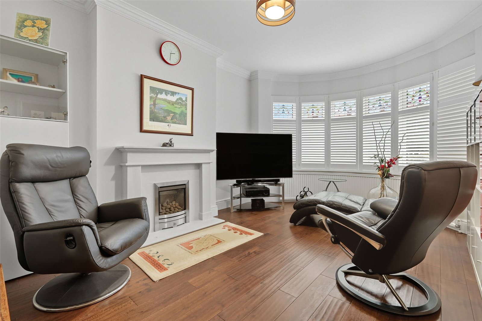 Approached via glazed double doors from the entrance hall. This bright well proportioned living room has full width double glazed curved bay window to front with fitted plantation shutters. Wood floor. Contemporary natural stone fireplace with coal effect gas fire. Two radiators. Ornate coving.