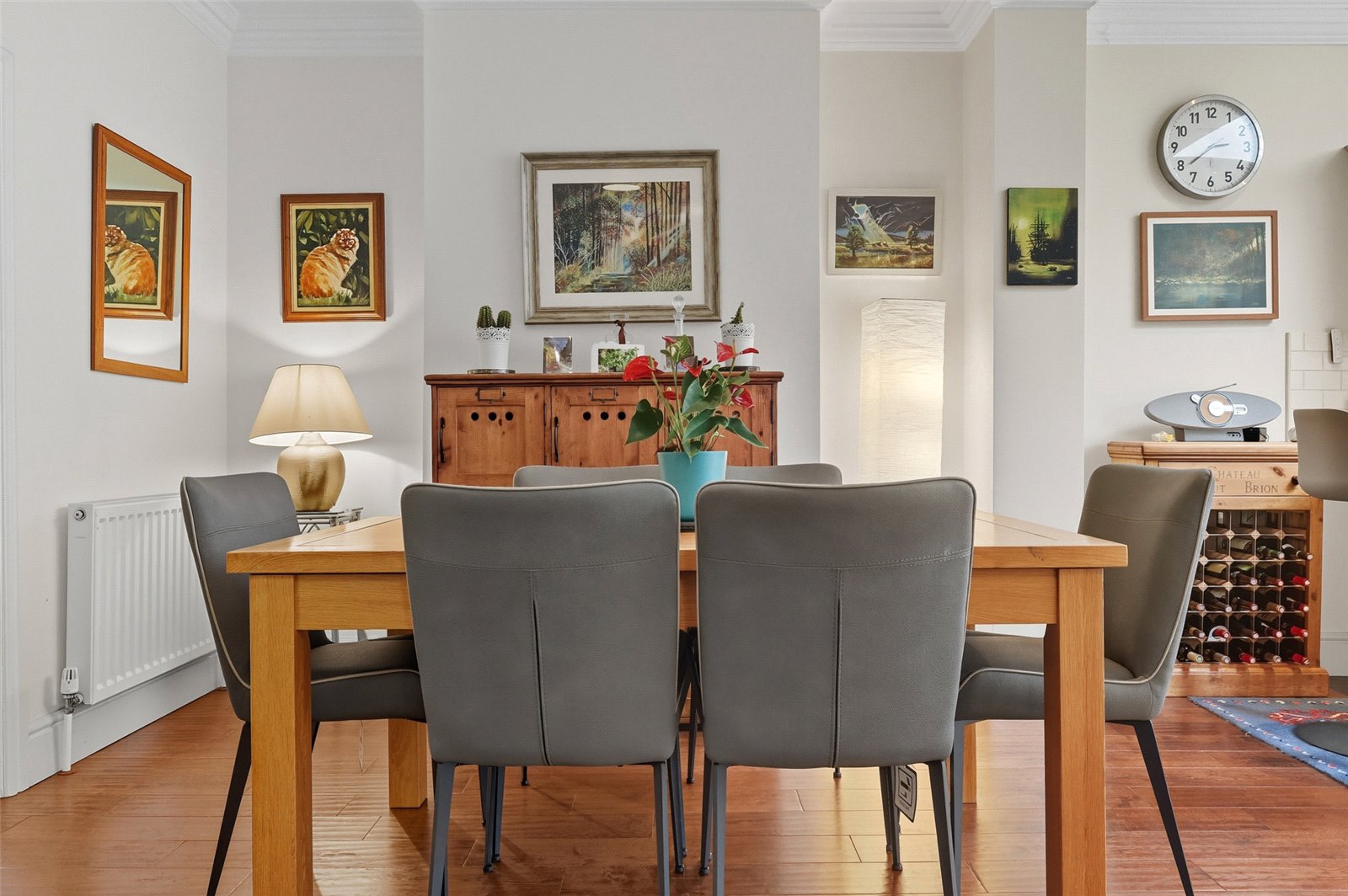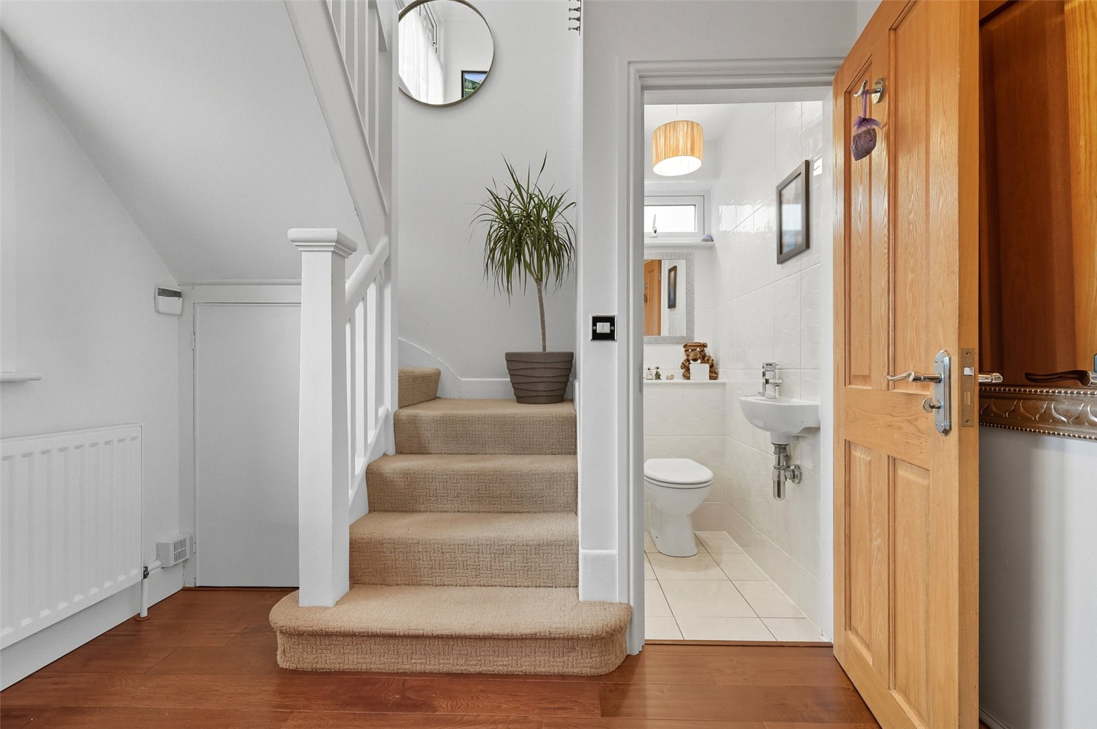 This charming and welcoming entrance hall is approached via covered porch, composite double glazed front door and window. Wood floor. Radiator. Ornate coving. Turing staircase to first floor. Doors to accommodation.