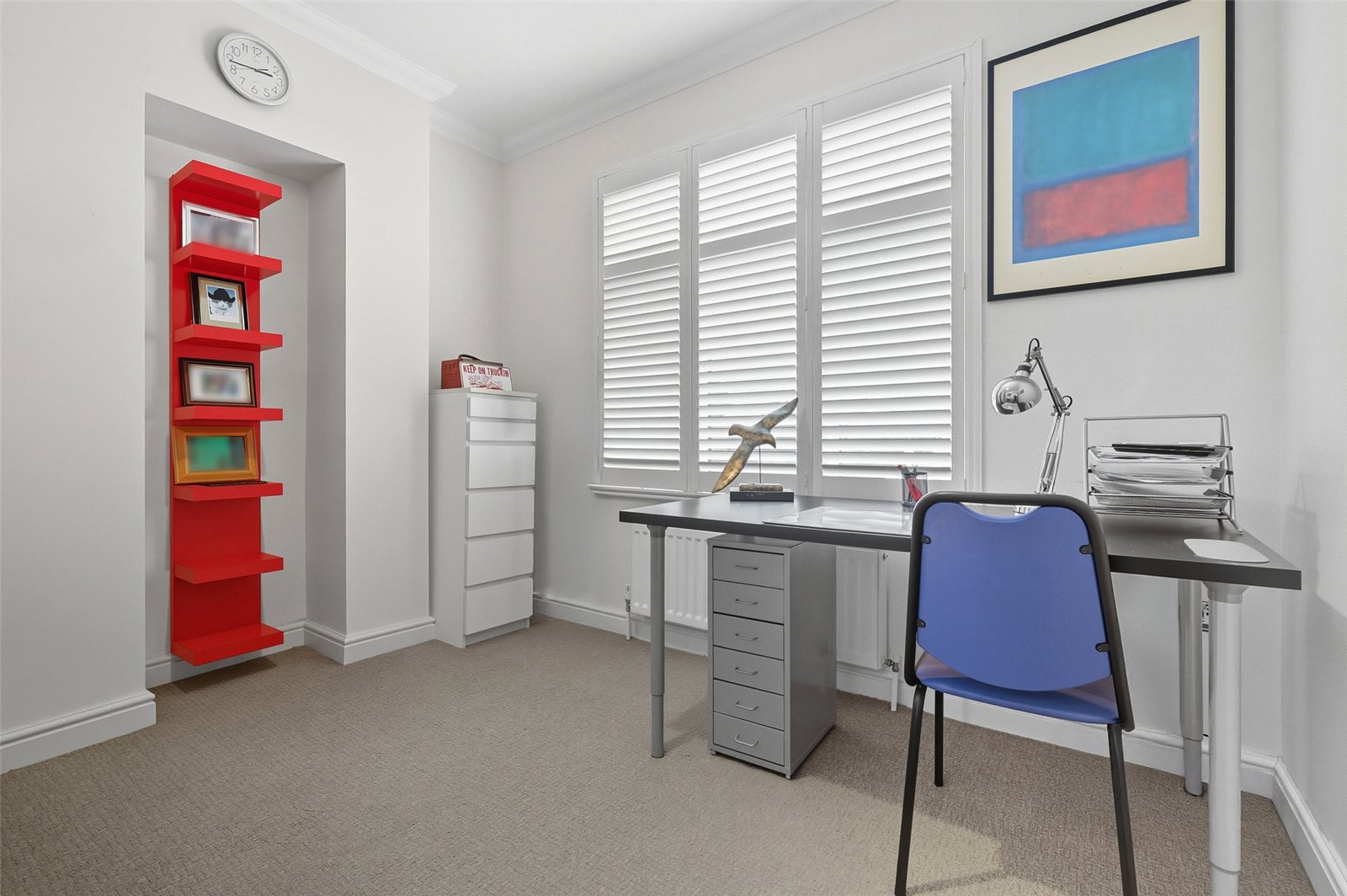 Bright and spacious double bedroom with a double glazed window overlooking the rear garden with fitted plantation shutters. Radiator. Coved ceiling.