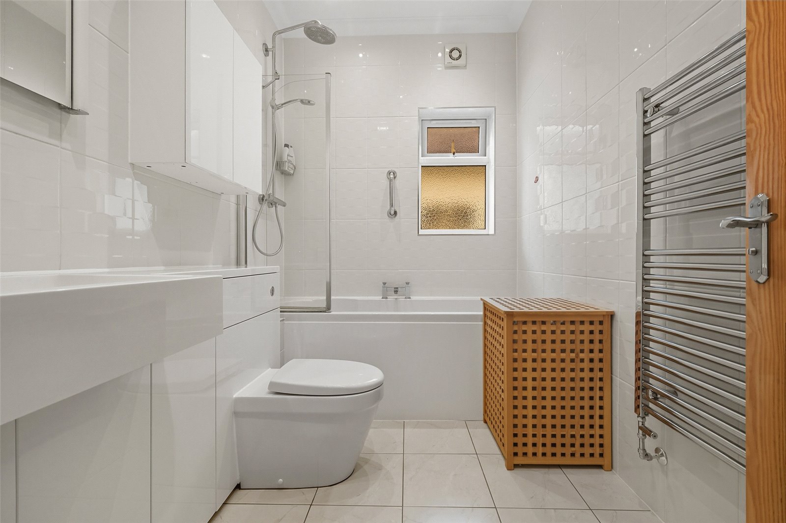 Fitted with a modern white suite comprising panelled bath with central mixer tap and separately plumbed shower over with rainwater showerhead and further shower attachment. Vanity bar incorporating wash basin and mixer tap, cupboards below. Concealed flush WC. Fully tiled walls. Tiled floor. Chrome heated towel rail. Coved ceiling with recessed ceiling lighting. Illuminated mirror. Shaver point. Double glazed window to side.