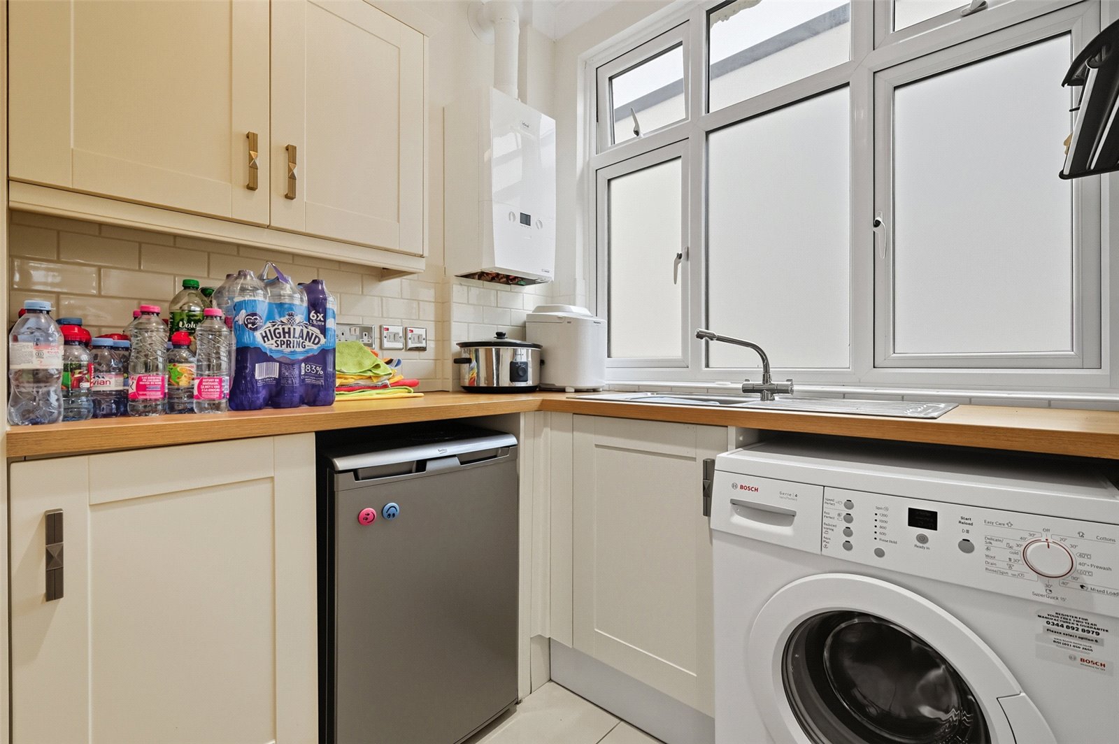 Fitted with a matching range of cream shaker style fronted units and work surfaces with inert stainless steel sink unit with mixer tap, cupboards below. Space and plumbing for washing machine. Wall mounted storage cabinets. Wall mounted Ideal gas fired central heating boiler. Part tiled walls. Tiled floor. Coved ceiling. Double glazed window to side.