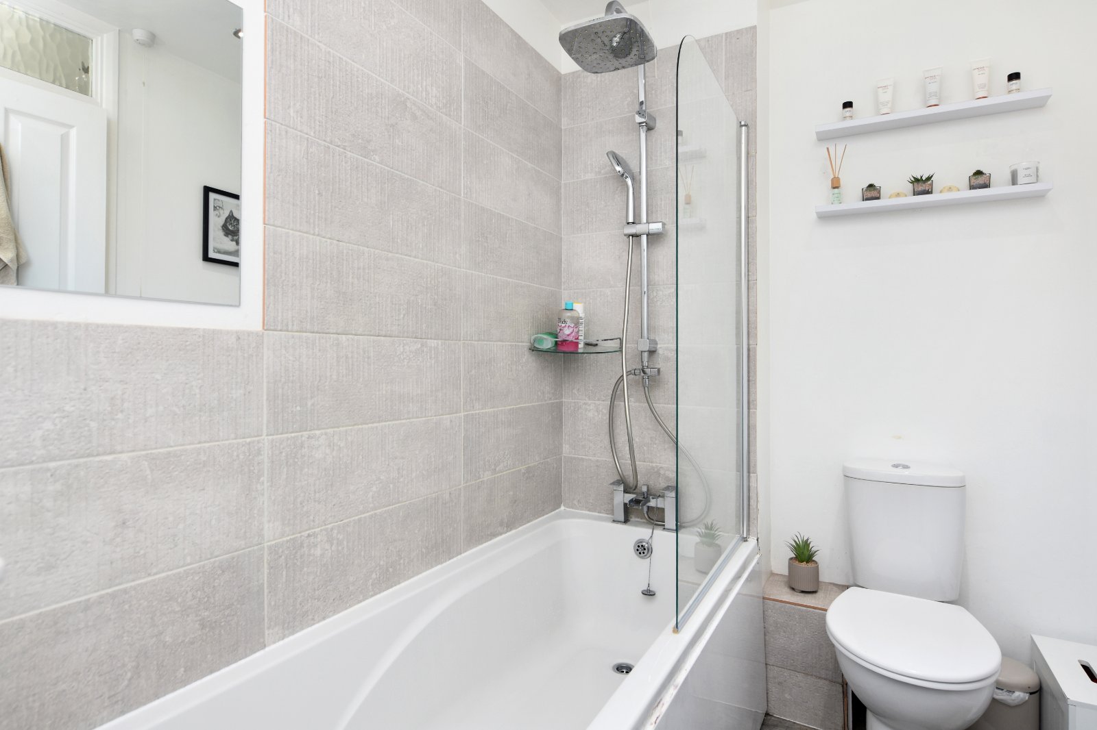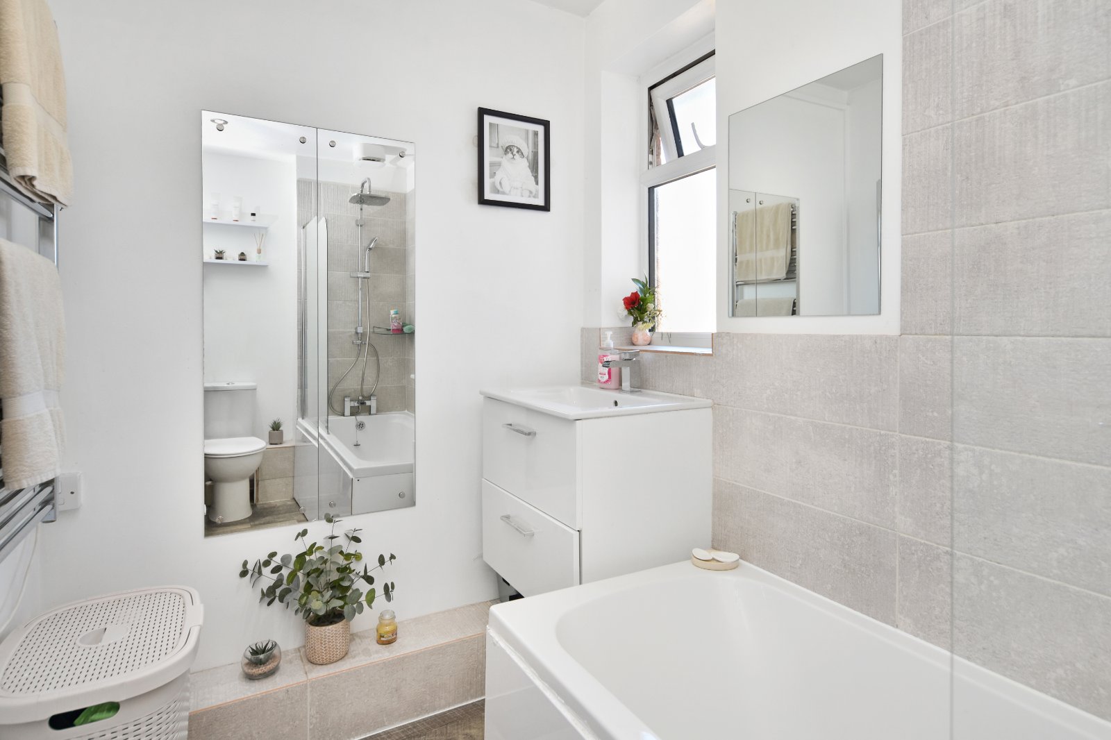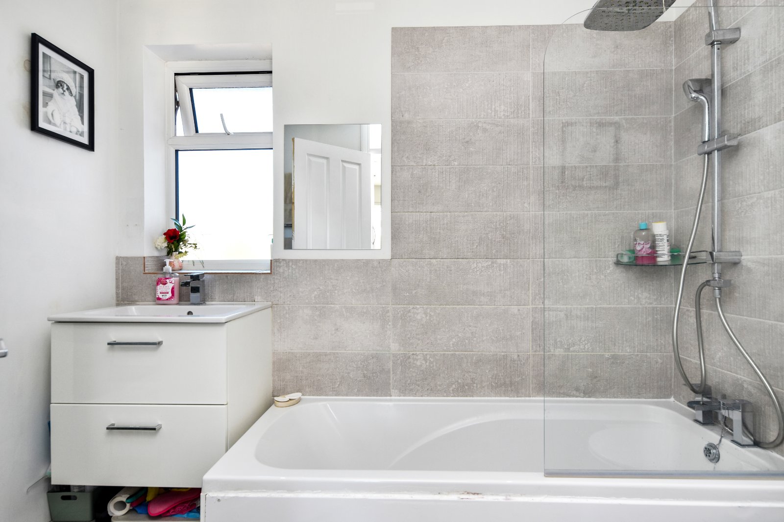 uPVC obscure double glazed window to front aspect. The white suite comprises a panelled enclosed bath with fitted shower screen, with mixer taps and shower attachment with drencher style shower head and additional hand held, low level dual flush WC and vanity wash hand basin with pair of drawers under and mixer tap over. Attractive partly tiled walls. Ladder style heated towel rail. Smooth plastered ceiling inset with recessed lighting and ceiling mounted extractor fan.