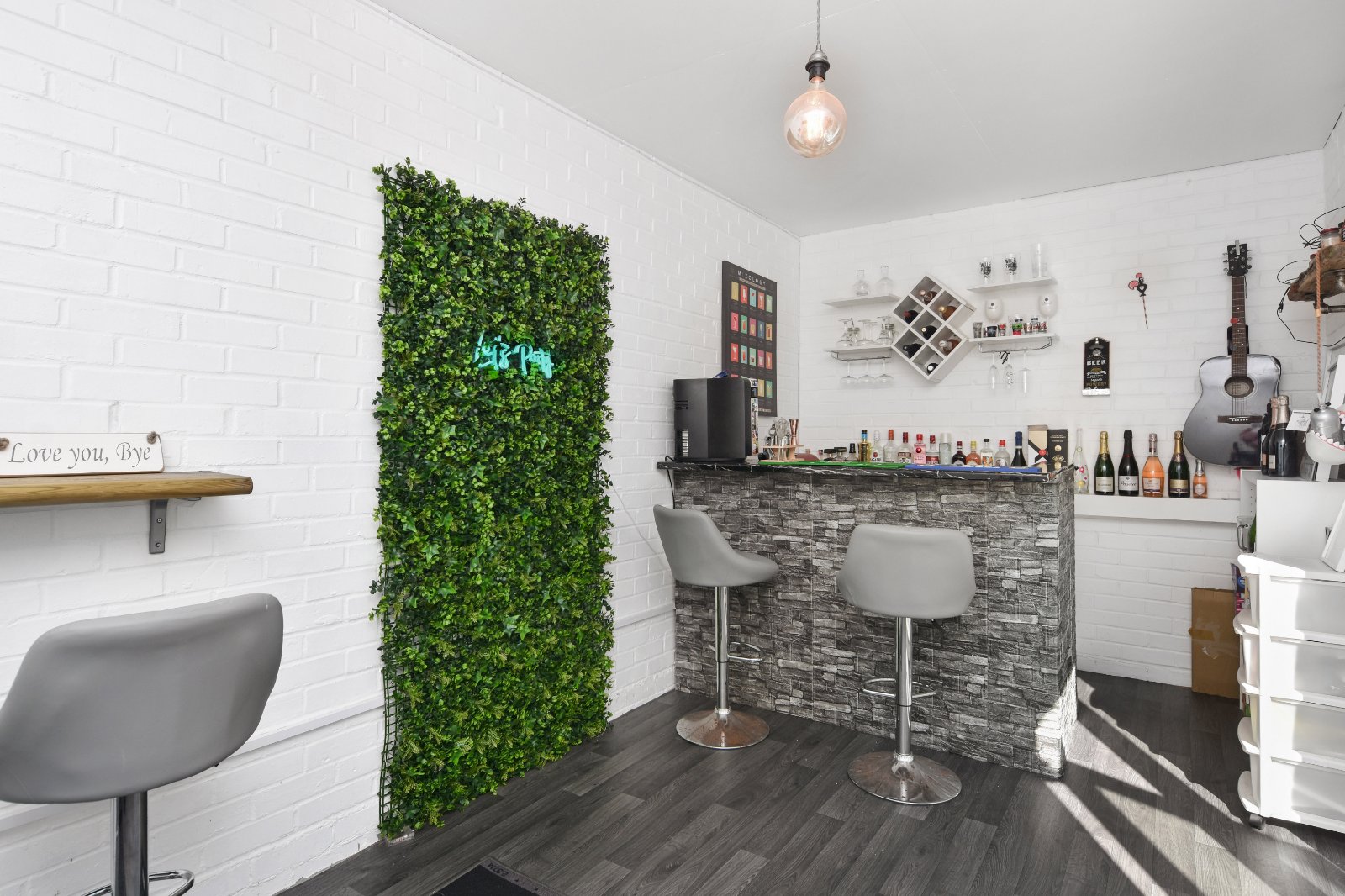 A superbly converted former garage, now arranged as a stylish and versatile Garden Bar, which is to remain as part of the sale. Finished with a plasterboard ceiling, painted brick walls and wood effect flooring, the space offers a contemporary and well-presented environment.