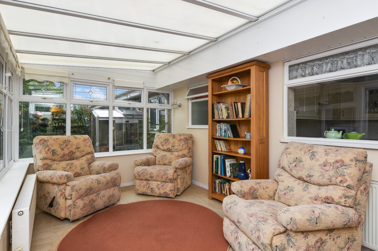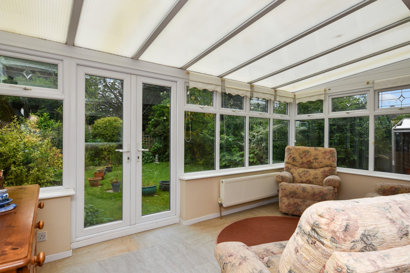 uPVC double glazed windows to rear and side aspect with leaded fanlight openers. Range of high level leaded fan light openers to one aspect. Pair if uPVC double glazed French doors opening to the rear garden. Wall light point. Radiator. Polycarbonate roof line.