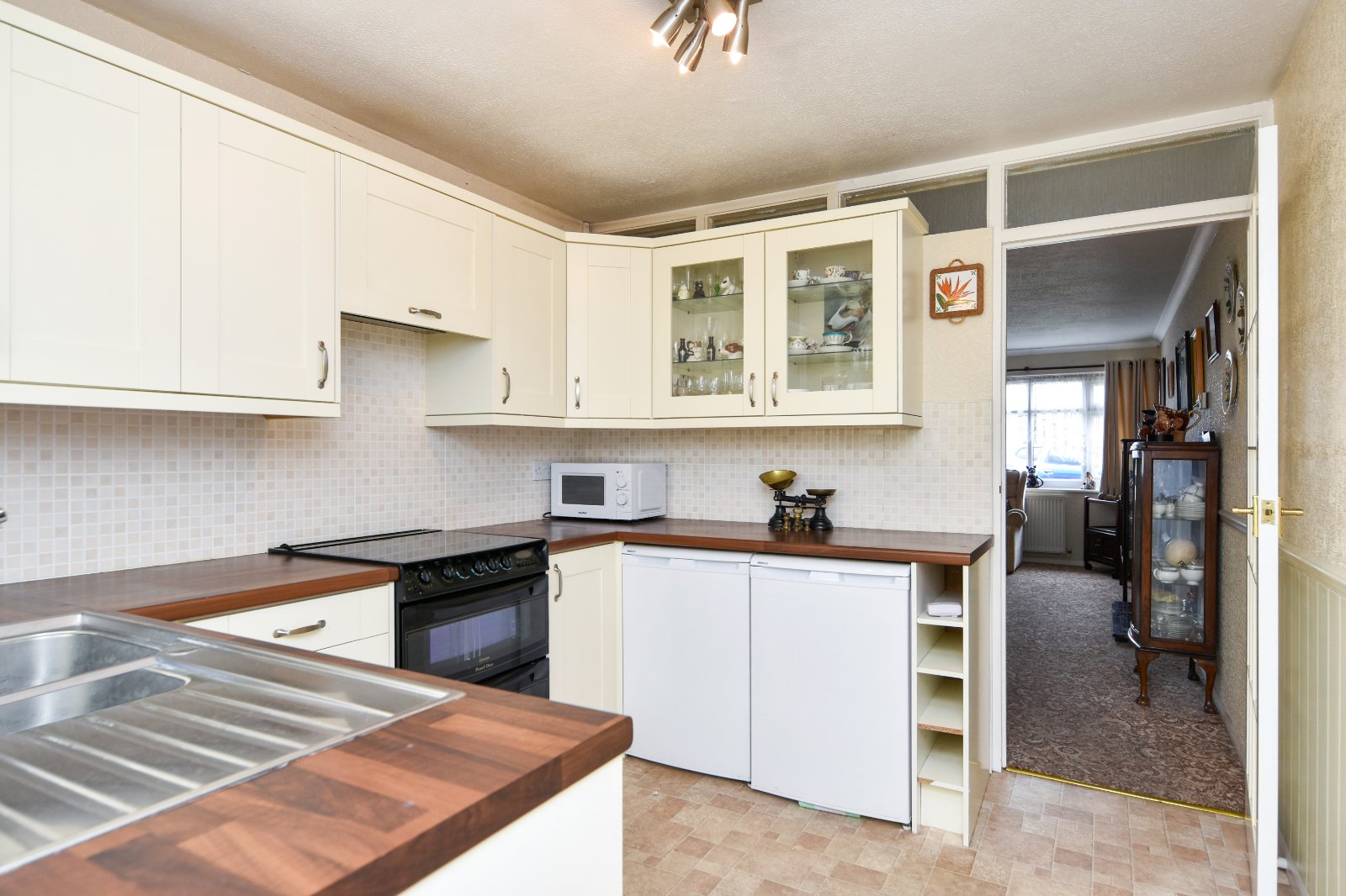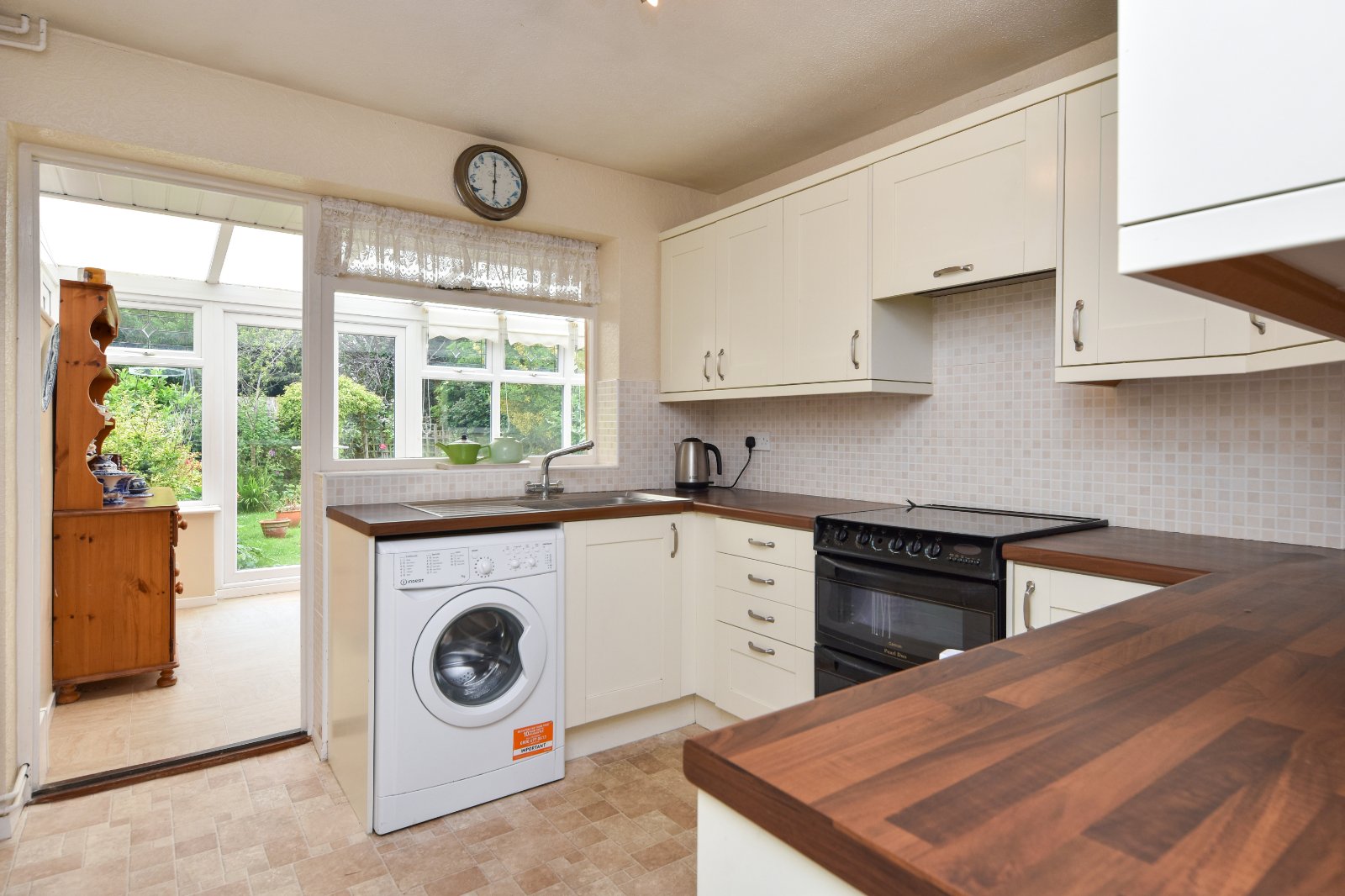 Glazed window to rear aspect overlooking the Conservatory. The Kitchen is fitted with a modern range of eye and base level cabinets with 'wood effect' rolled edge working surfaces over inset with single drainer stainless steel sink unit with mixer tap over. Freestanding oven (Agent Note - we have been advised by the sellers that they are unsure whether this is in working order) with wall mounted extractor over. Undercounter 'Beko' fridge and freezer (to remain). Under counter washing machine (to remain). Attractive splashback tiling. Radiator. Textured ceiling. Open access to;