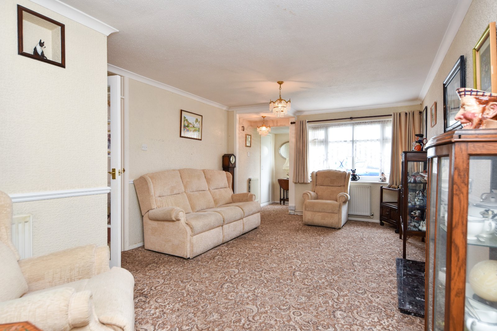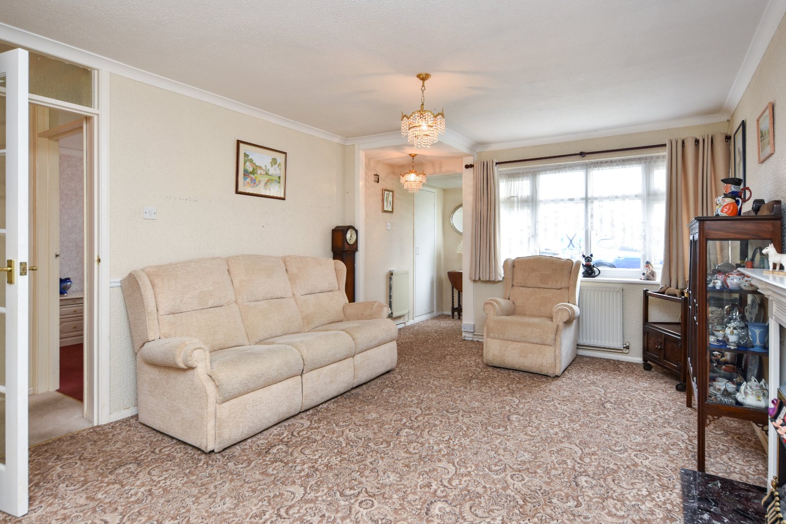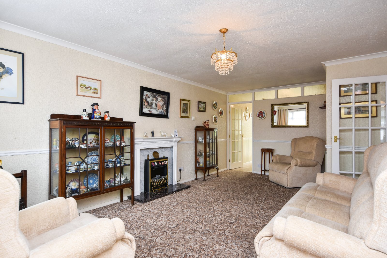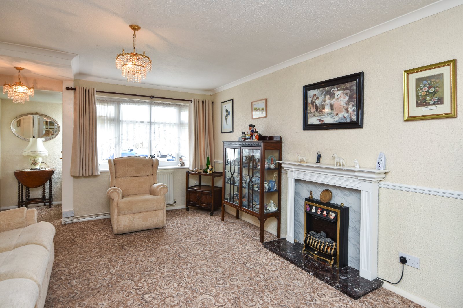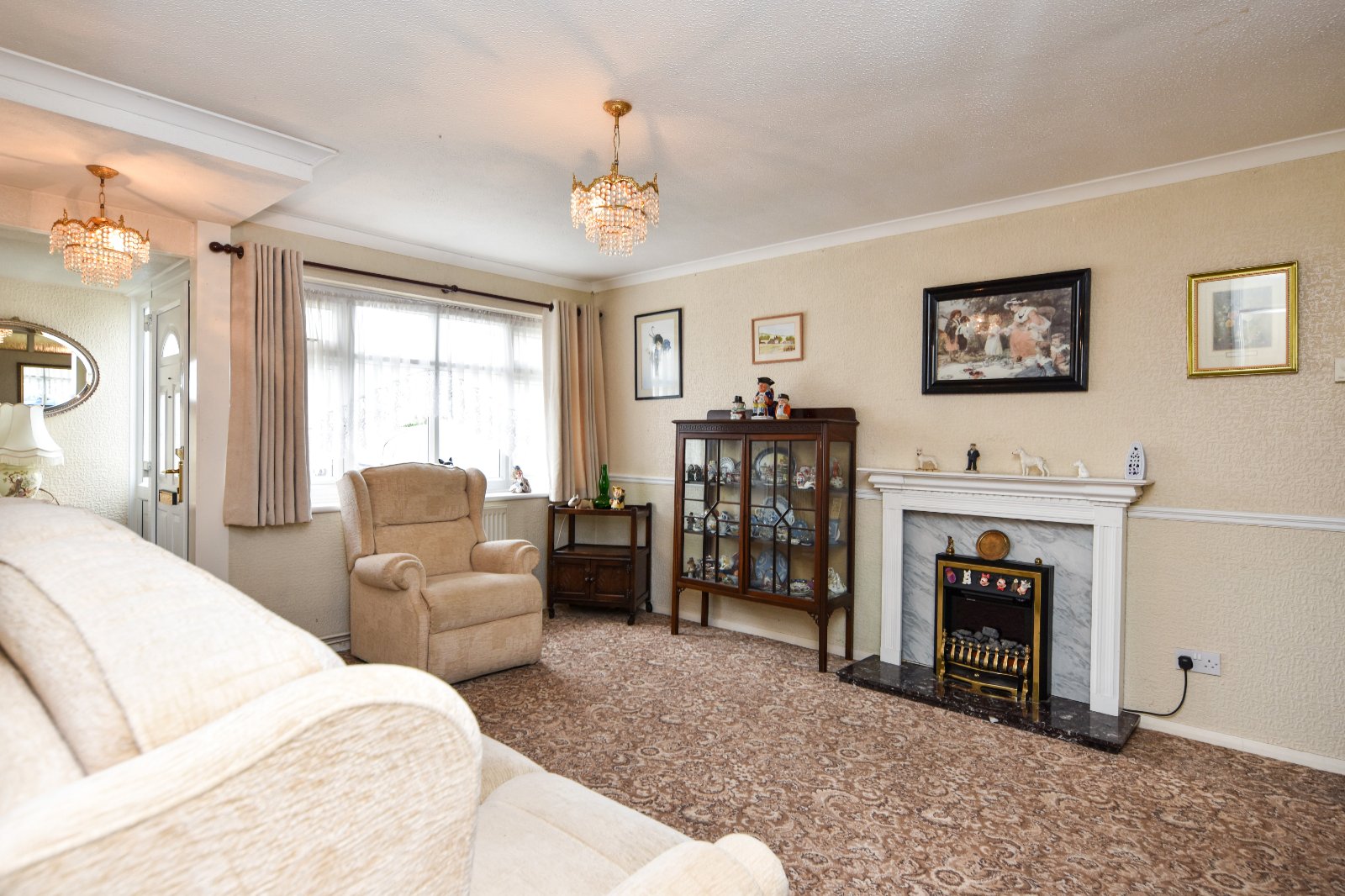 uPVC double glazed window to front aspect. Feature fireplace with decorative surround with mantle over, marble hearth inset with fireplace. Two radiators. Dado rail. Thermostat control point. Multi pane glazed doors to Kitchen and Inner Lobby area. High level obscure 'borrowed light' windows to Kitchen. Coving to textured ceiling.