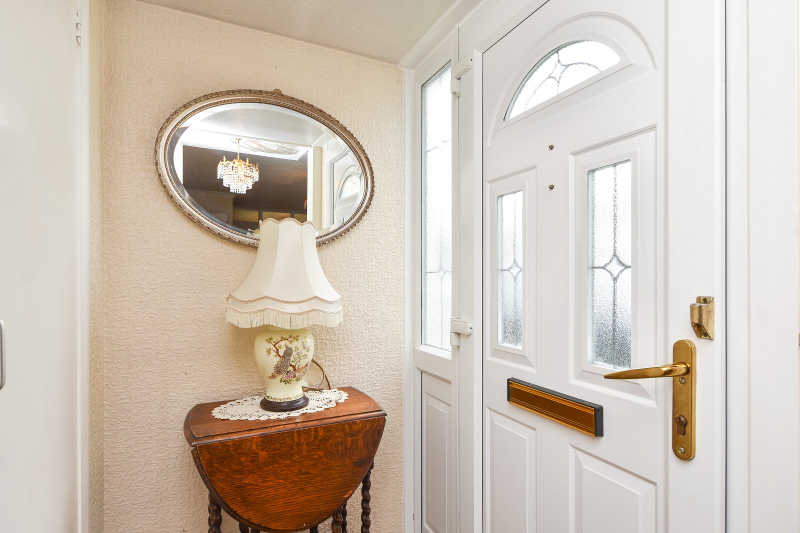 uPVC door inset with a pair of obscure leaded double glazed inserts with matching obscure glazed side panel into: