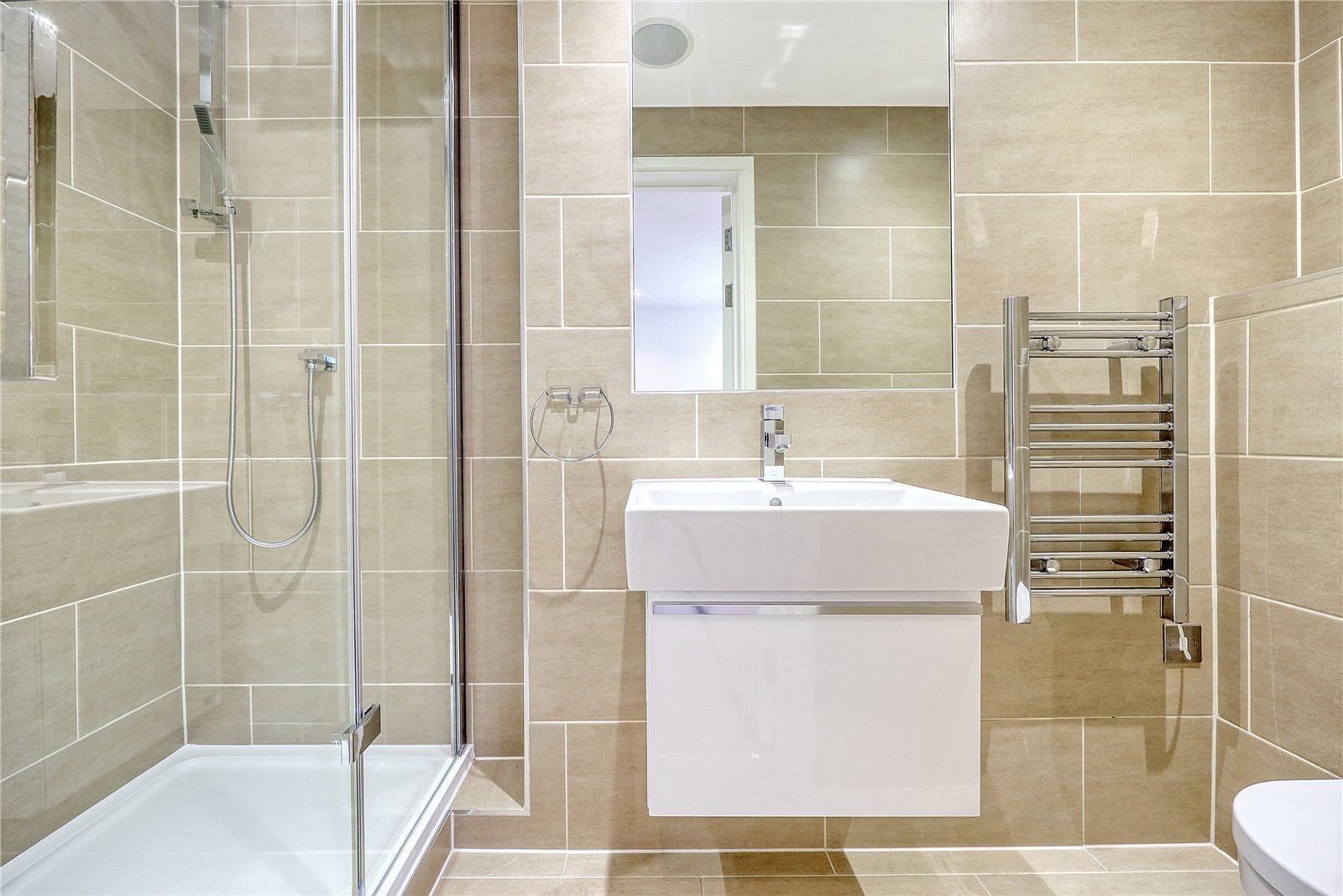 Fully tiled in quality ceramics. Fitted with a three-piece suite by 'Villeroy & Boch' with frameless glass shower enclosure with handheld and rainwater shower fittings, and vanity wash basin with gloss fronted storage drawer and designer mixer tap. Integrated cistern WC. Heated towel rail. Recessed mirror. Smooth plastered ceiling with recessed LED lighting.
