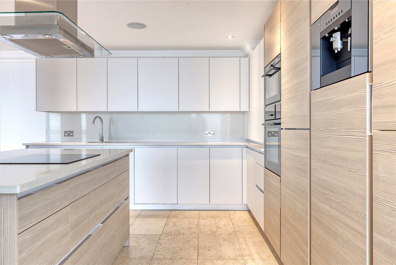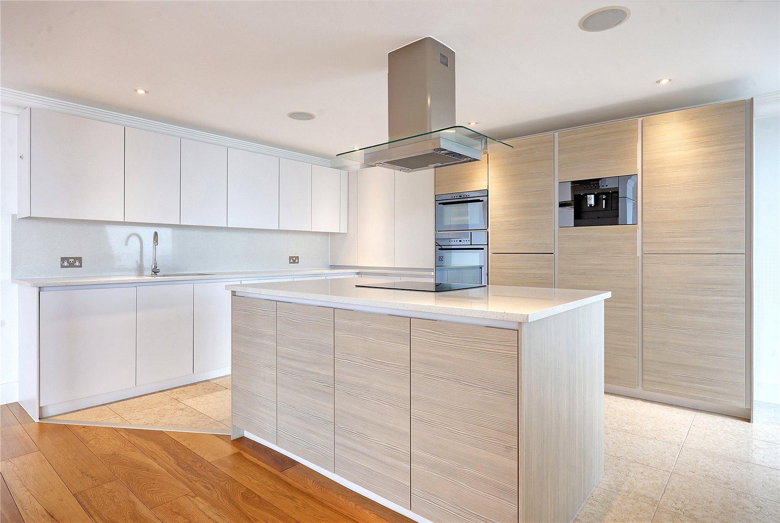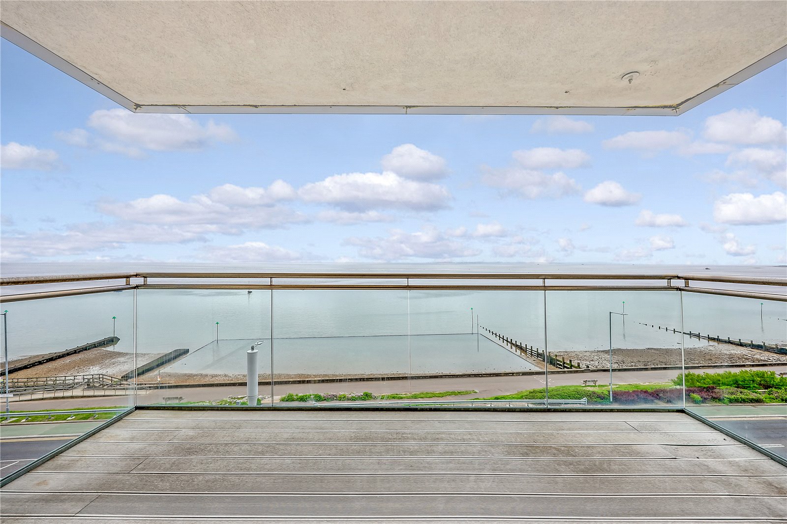 The kitchen has a double glazed panoramic window to front with views across the Thames Estuary. Comprehensively fitted with frameless contemporary cabinets by 'Paul Newman' with extensive quartz working surfaces with inset stainless steel sink unit with grooved drainer and 'Franke' mixer tap. The full range of integrated appliances include 'V-Zug' steam & convection oven, 'bean-to-cup' coffee machine, 'Siemens' dishwasher, fridge, freezer and washer/dryer. Central breakfast island with four-ring black 'Bosch' induction hob and contemporary extractor canopy above. Siemens fridge and freezer. Porcelain tiled flooring with zoned underfloor heating. Ornate coved cornice to smooth plastered ceiling with recessed LED lighting.