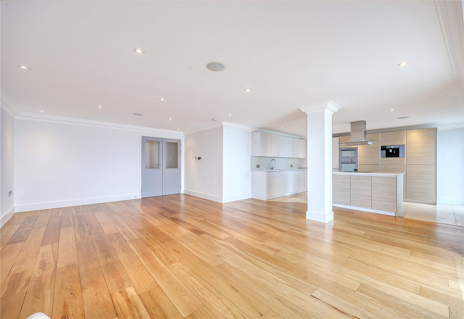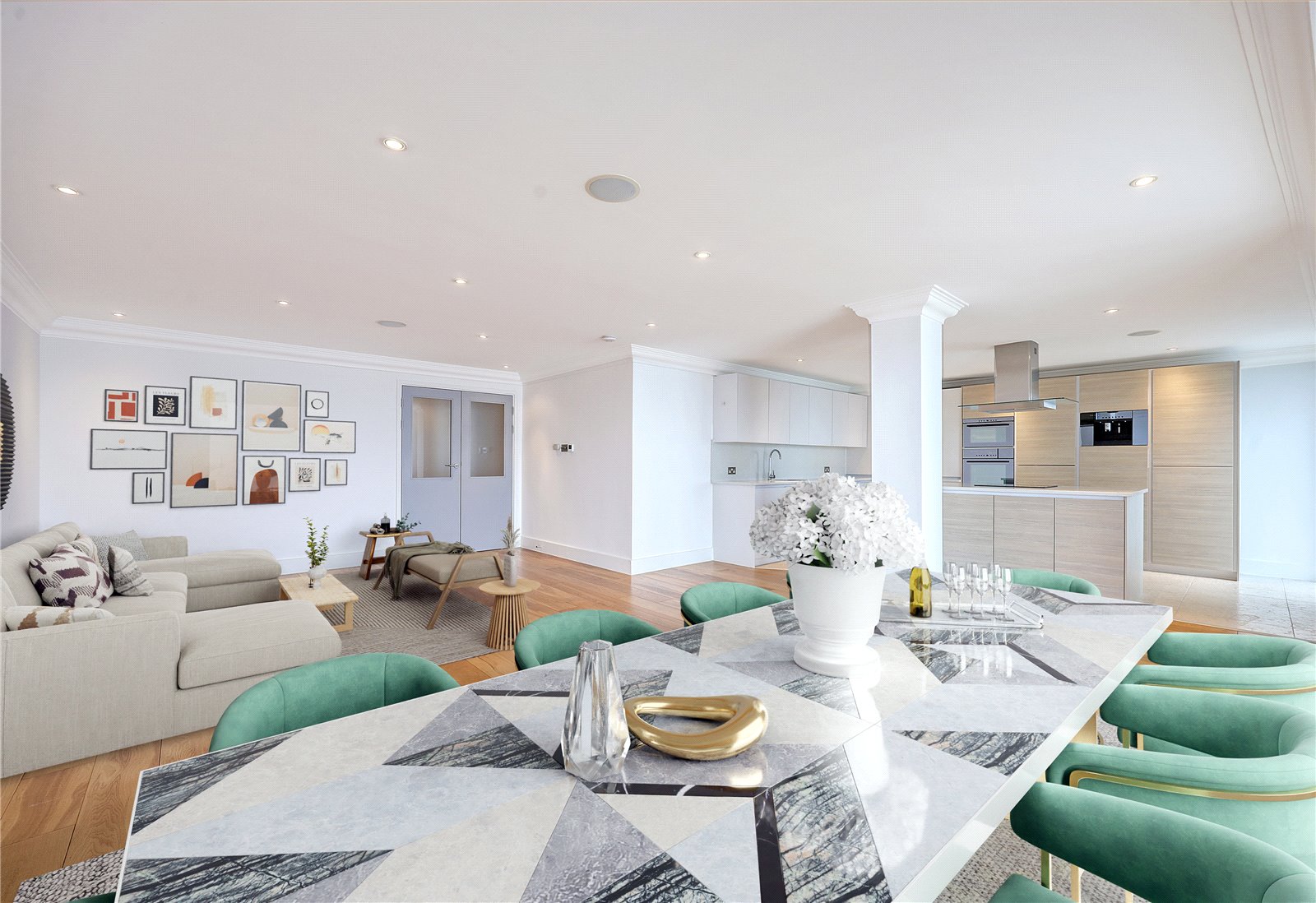 (Overall open-plan dimensions) Aluminium double glazed patio doors give access to the large sun terrace, with steel and glass balustrade. Oak flooring with zoned underfloor heating. Integrated wiring for flat screen television. Comms point. High level contemporary skirting. Ornate coved cornice to smooth plastered ceiling with recessed LED lighting.