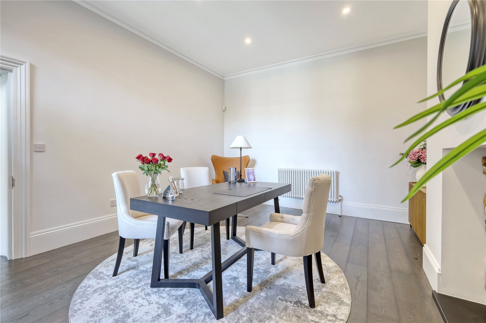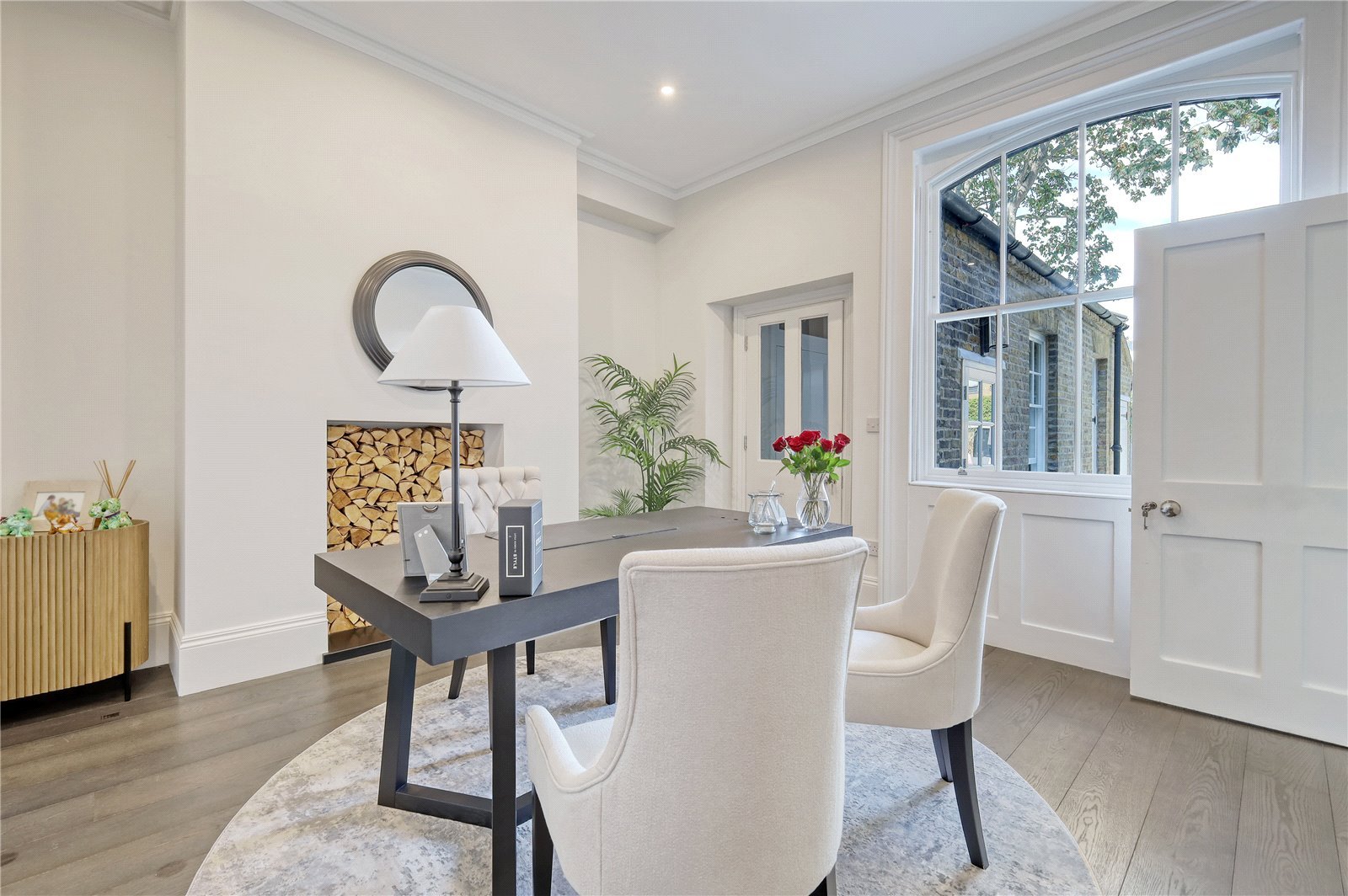 A further exquisite south-facing room with a pair of arched topped, tall sash style uPVC double glazed windows to front aspect offering uninterrupted views of the Cricket Green, with original under-window Victorian-style shutter storage boxes. Solid wood flooring. Traditional style column radiator. Stone fireplace surround with mantle hearth inset with wood burning stove. Period feature wall panelling. Cornice to smooth plastered high ceiling