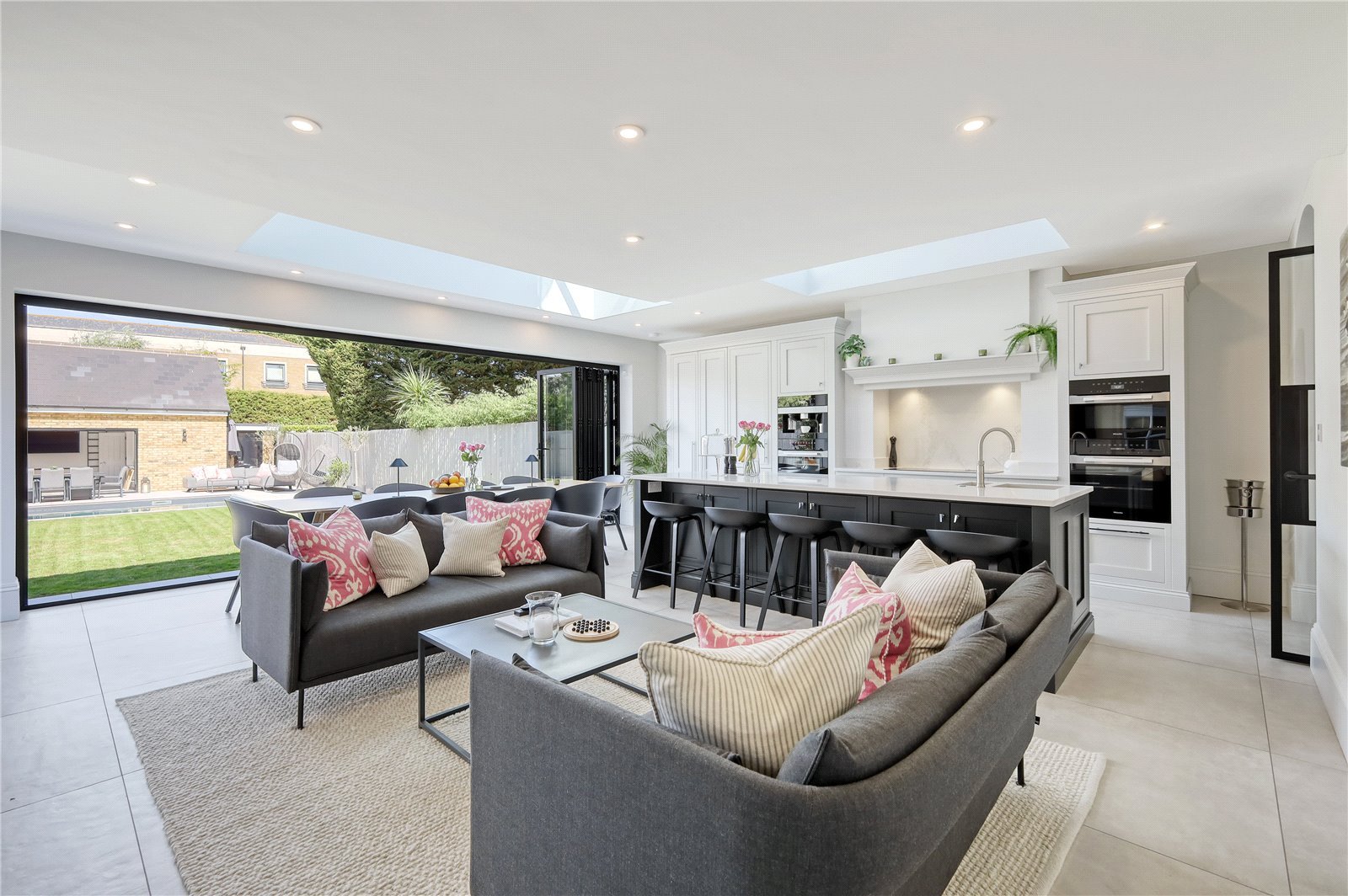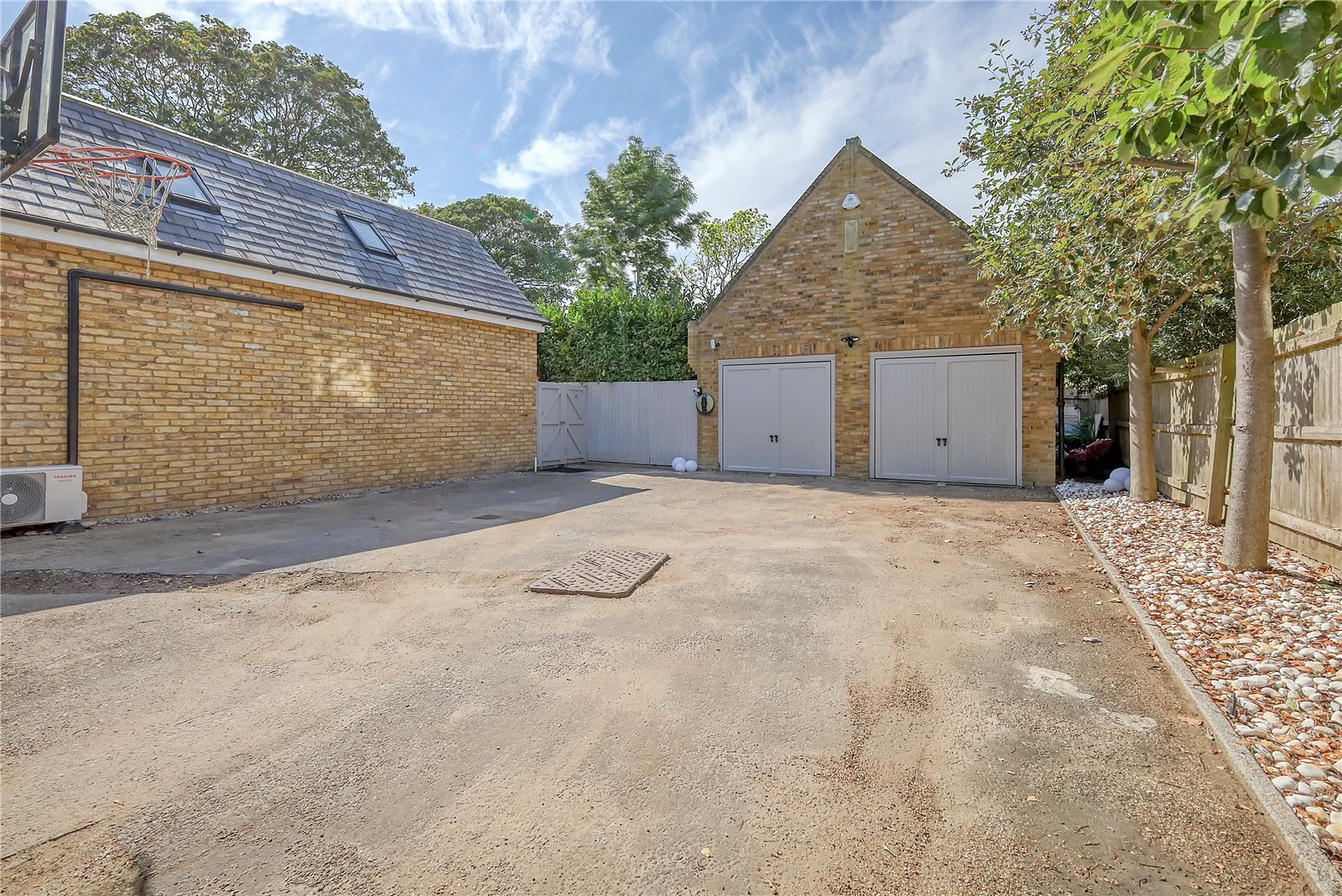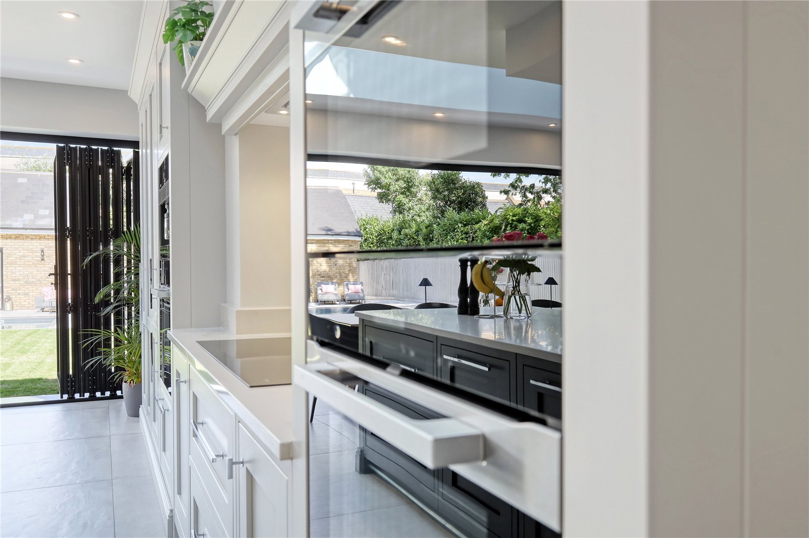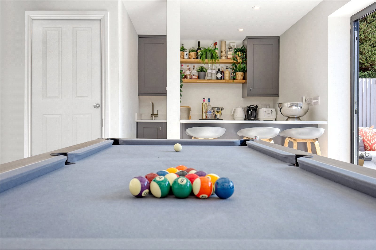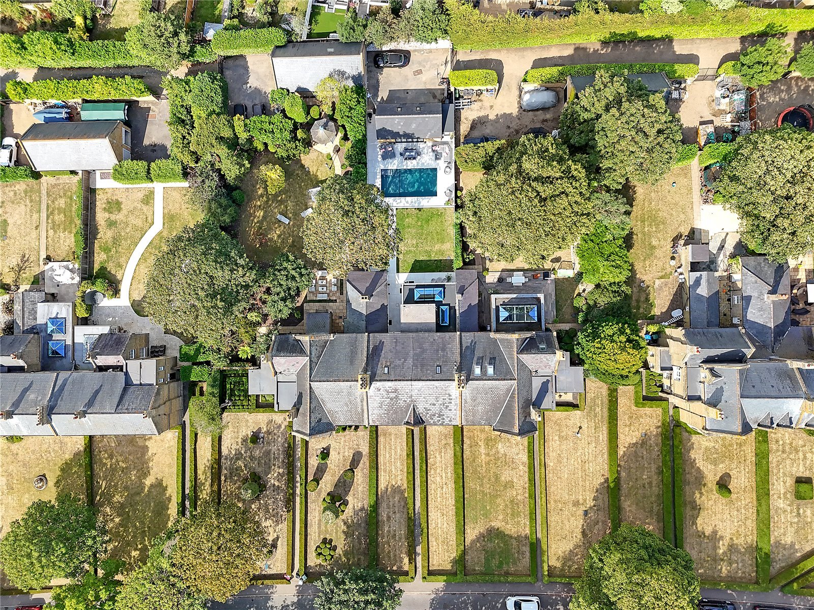 The ground floor includes four reception rooms: a formal Living Room and an elegant Dining Room, both overlooking the cricket green; a cosy TV room/snug; and a separate Home Office. A sublime open-plan Kitchen/Family Room, which boasts almost full-width bi-fold doors opening onto a fully landscaped garden. This outdoor space features a stunning heated swimming pool, a pool house with a bar area, ample entertaining space, and mezzanine levels. There is also the addition of a spacious Utility Room and a Guest Cloakroom/WC.