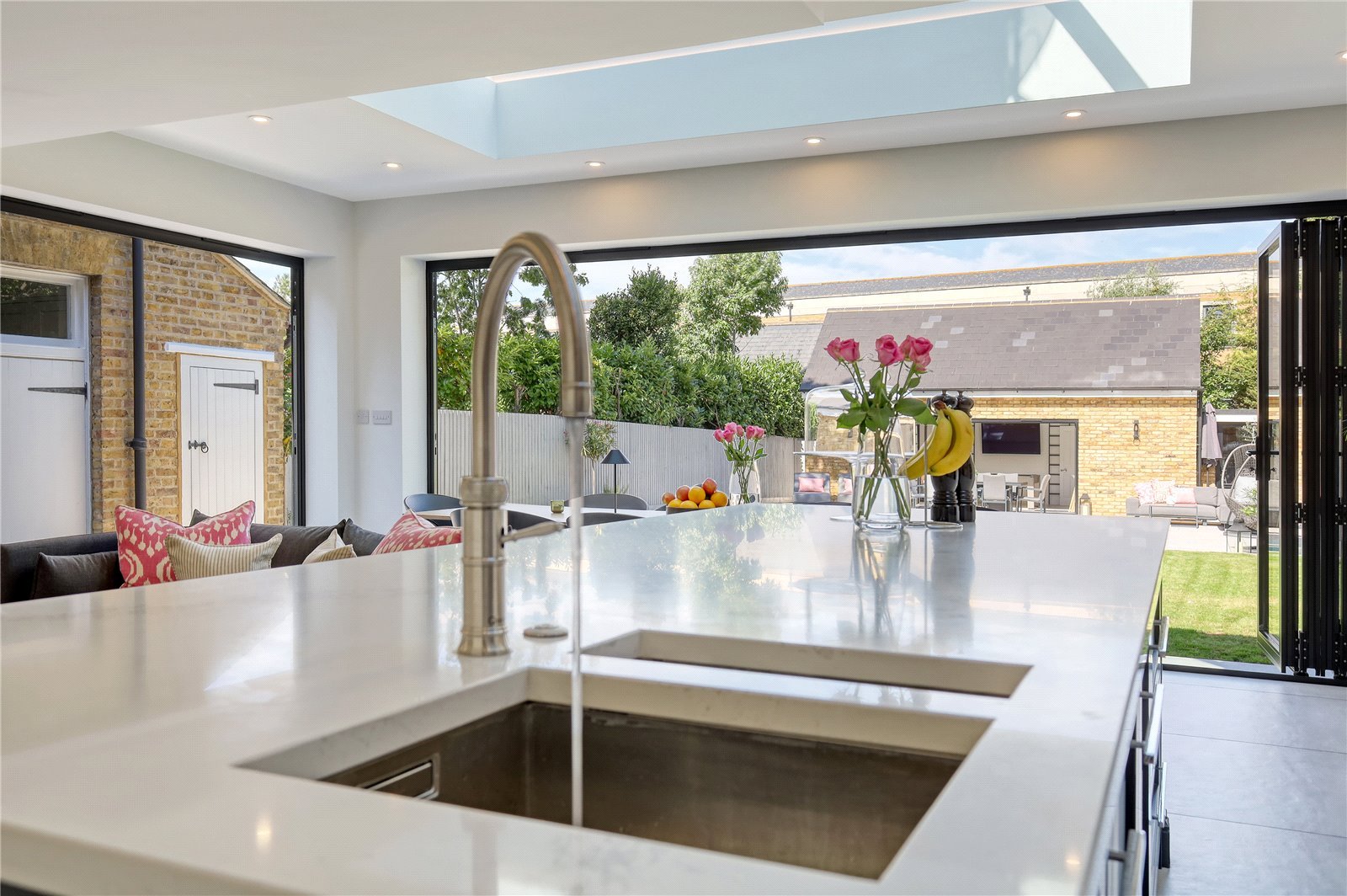 The Kitchen area is fitted with a sensational range of cabinetry to one aspect with Quartz working surfaces. The range of 'Miele' appliances include a pair of eye level ovens with separate microwave and feature built in 'Miele' coffee maker offering freshly ground coffee and patented Cup Sensor. Impressive induction hob with concealed extractor over and inset lighting and matching Quartz splashback. The integrated appliances include concealed fridge/freezer. There is a stunning oversize breakfast bar seating area with stunning Quartz worktops inset with a stainless steel sink unit with waste disposal, with 'Quooker' tap which boasts filtered chilled still and sparkling together with boiling water. There are further under counter cupboards including a pull out bin with waste & recycling sections and dishwasher. Underfloor heating throughout. Smooth plastered ceiling inset with recessed lighting and a pair of uPVC double glazed pitched roof lanterns. Pair of 'Crittall' style glazed doors to Snug/Tv Room.