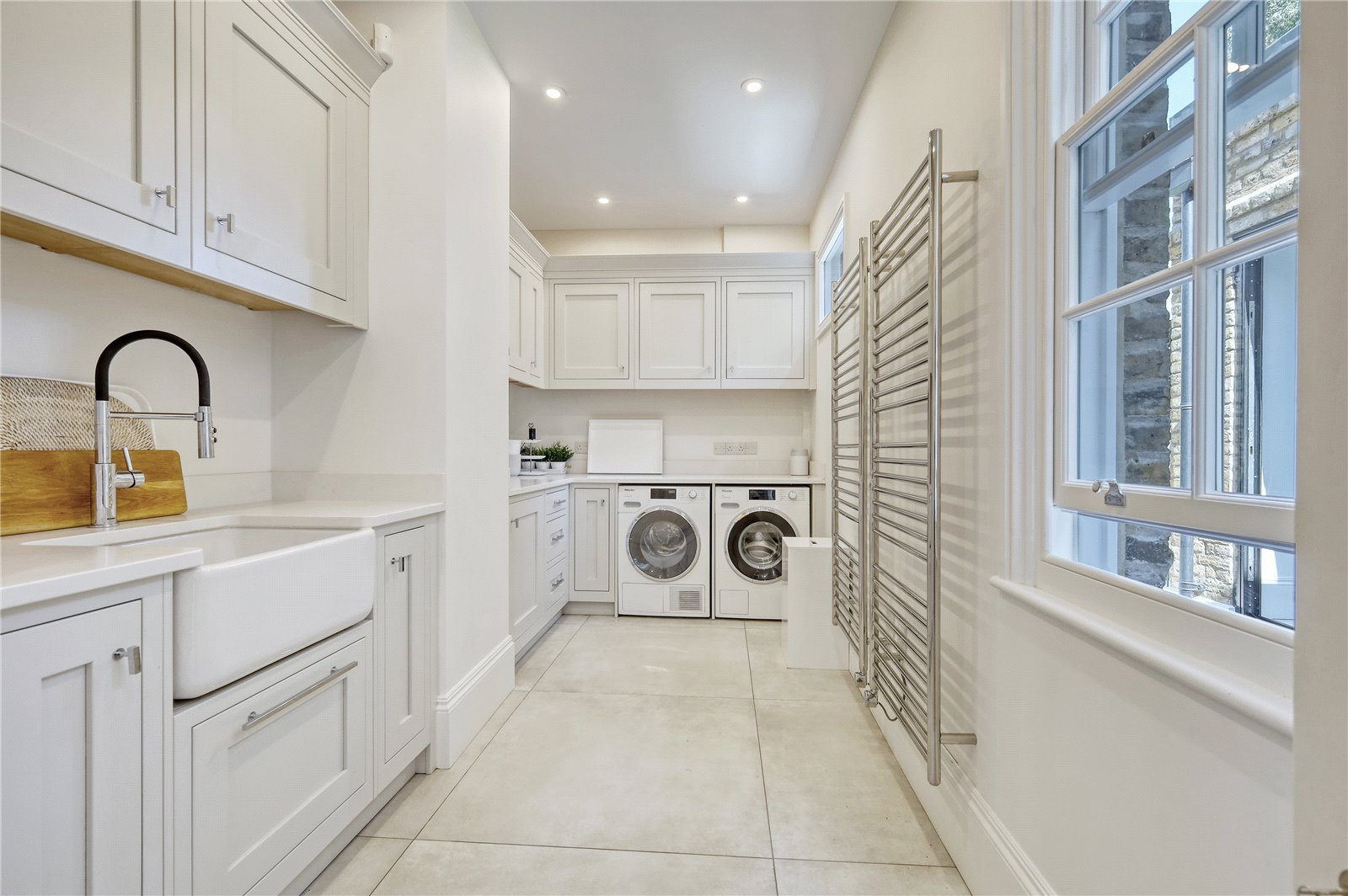 High level window to side aspect. Sash style uPVC double glazed window to side. The range of high end fitted eye and base level cabinetry comprises Quartz worktops inset with butler style sink unit with designer style mixer tap over. Pair of doors to good size Laundry Cupboard with ample hanging space and shelving. Feature porcelain non-slip tiling to the floor. Pair of large wall mounted heated towel rails. Smooth plastered ceiling inset with recessed lighting.