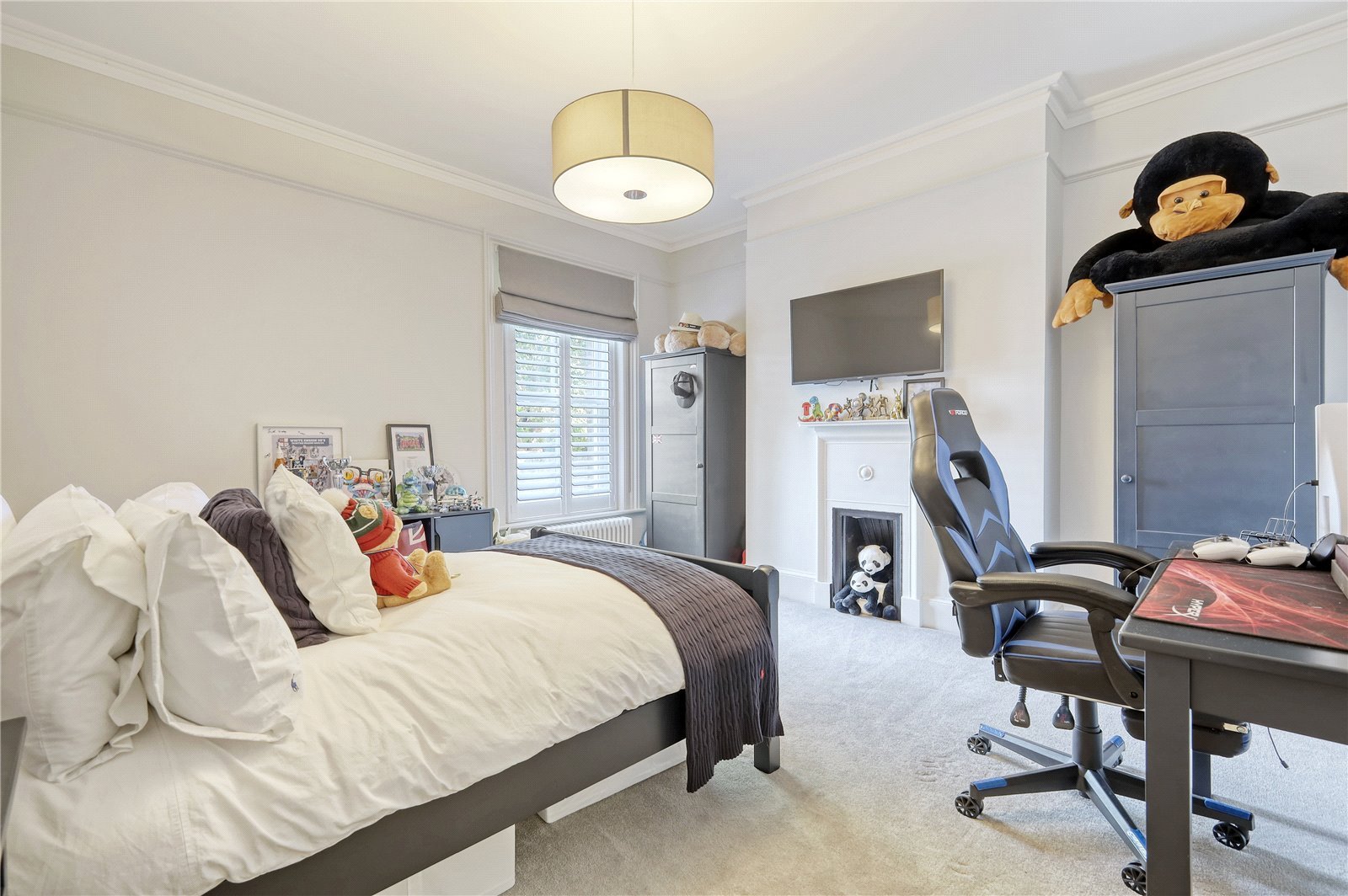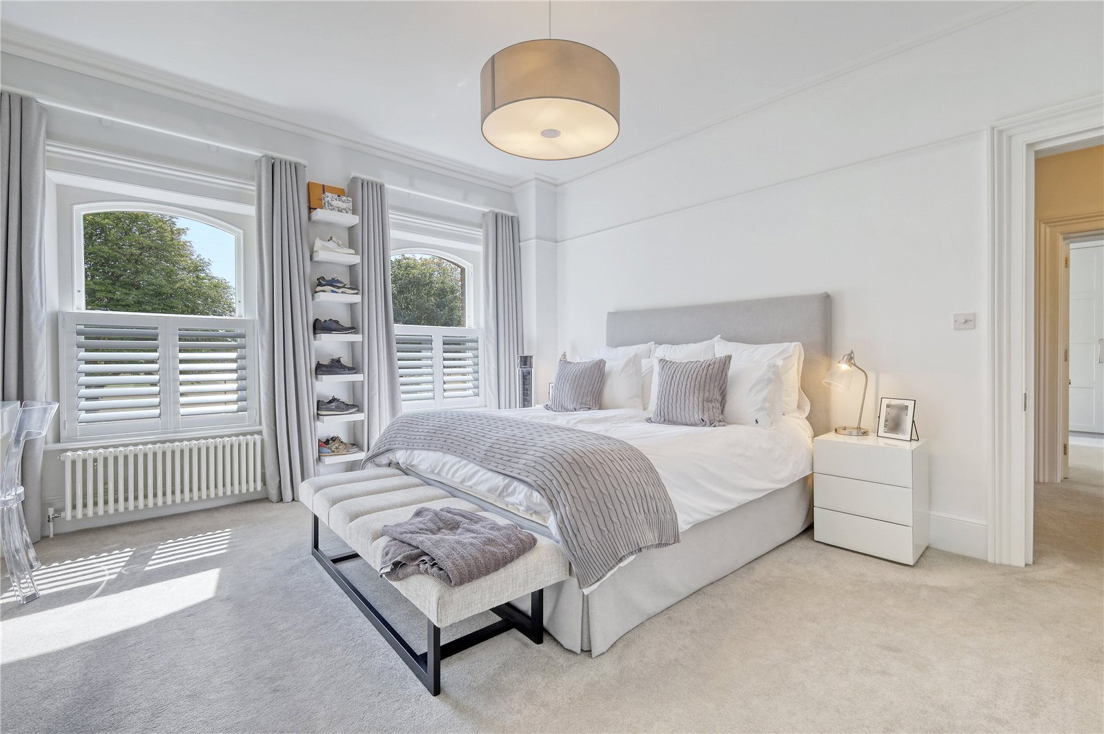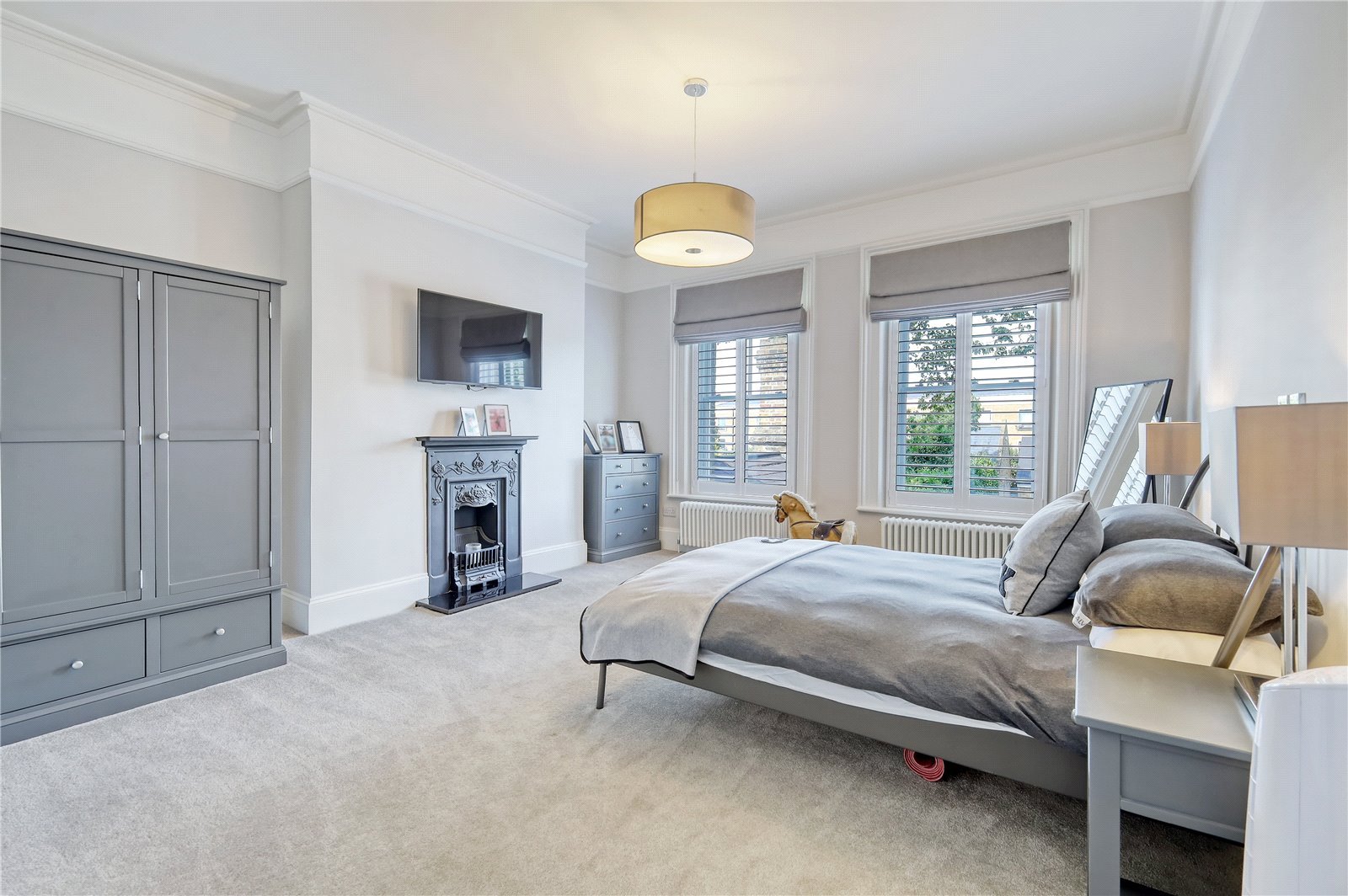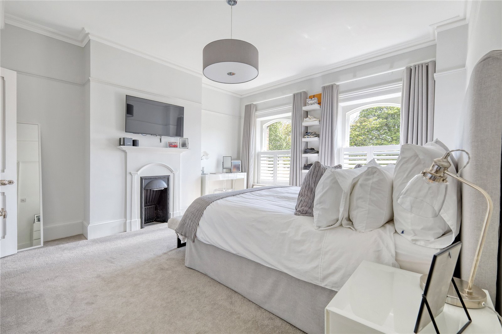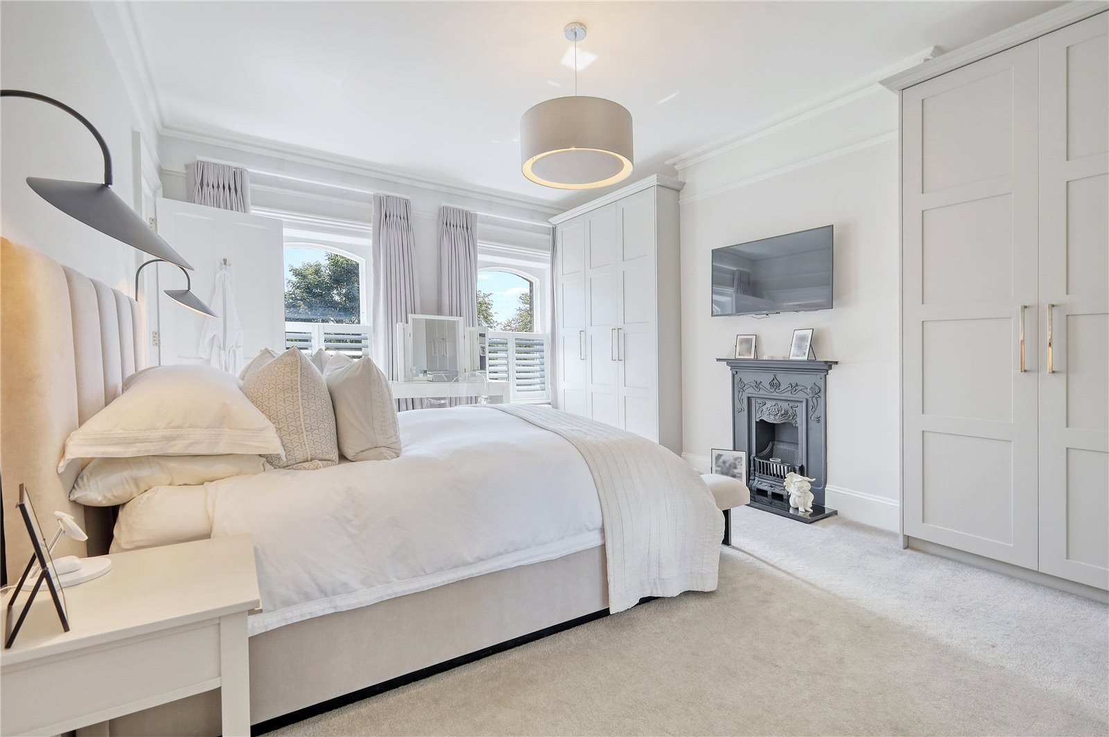 A wonderful Bedroom suite with a pair of south-facing arched topped, sash style uPVC double glazed windows to front aspect with 'half height' made to measure fitted shutter blinds, offering uninterrupted views of the Cricket Green and Pavilion. Pair of under window traditional style column radiators. Pair of three door 'almost full height' built wardrobes with original wrought iron decorative fireplace with mantle over inset to centre. Picture rail. Cornice to smooth plastered high ceiling. Panelled door to;