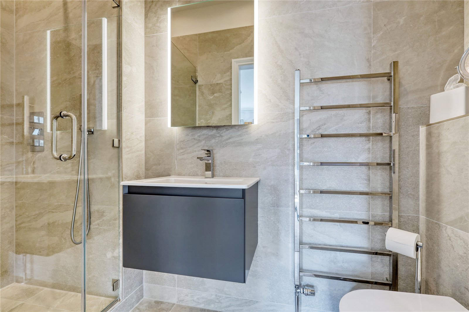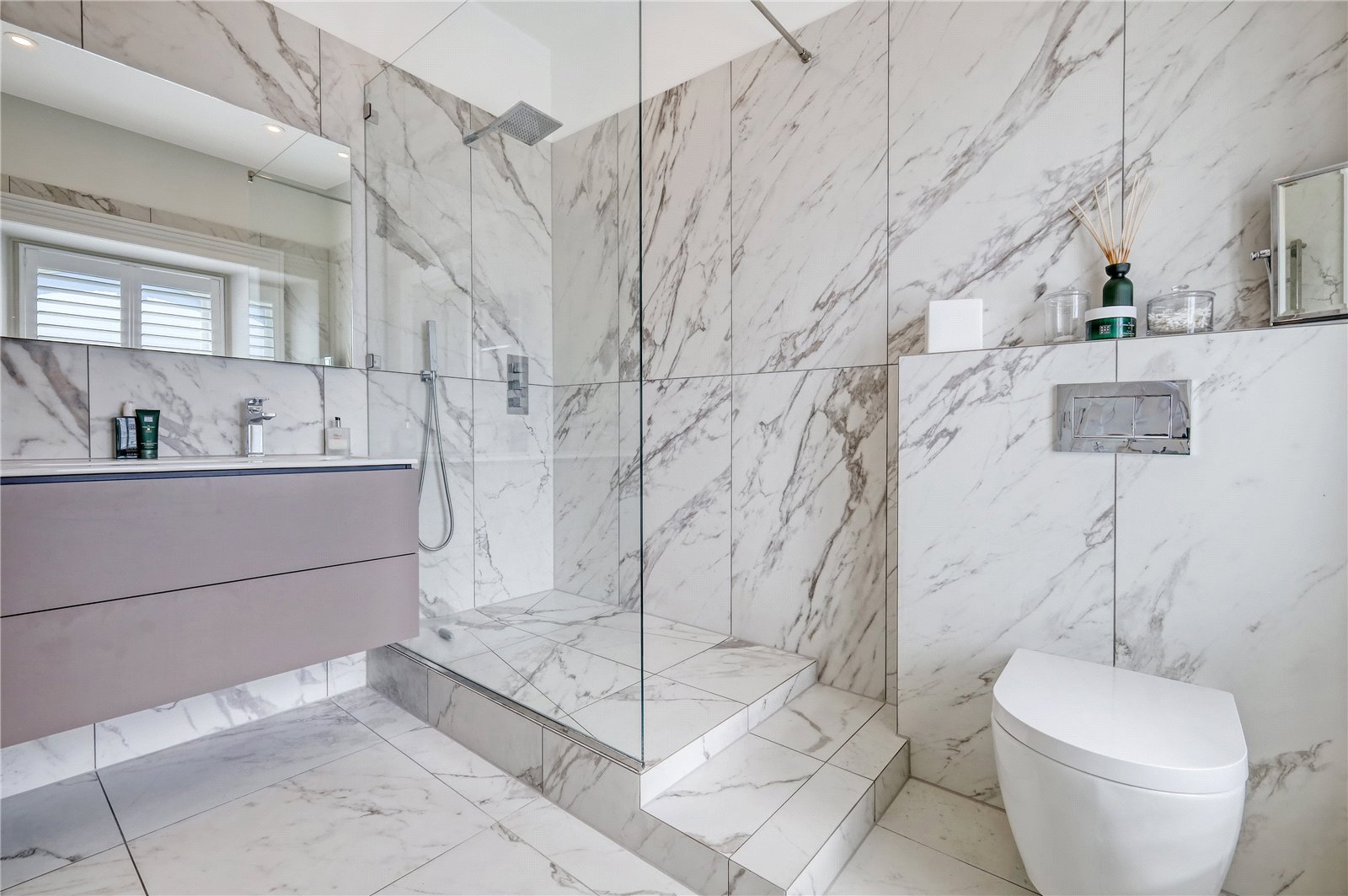 Sash style uPVC, part obscure, double glazed window to front aspect inset with made to measure shutter blinds. The Ensuite has been fitted with a bespoke range of sanitary-ware to include a 'Duravit' triple width vanity wash hand basin with pair of mixer taps over with storage drawers under and concealed cistern dual flush wc. Feature part raised shower enclosure with fitted shower screen to one aspect, tiled flooring and drain away outlet, with integrated shower unit with wall mounted controls, oversize rain shower style shower head and additional hand held. Wall mounted ladder style heated towel rail. Feature marble tiling to walls and floor. Smooth plastered ceiling inset with recessed lighting.
