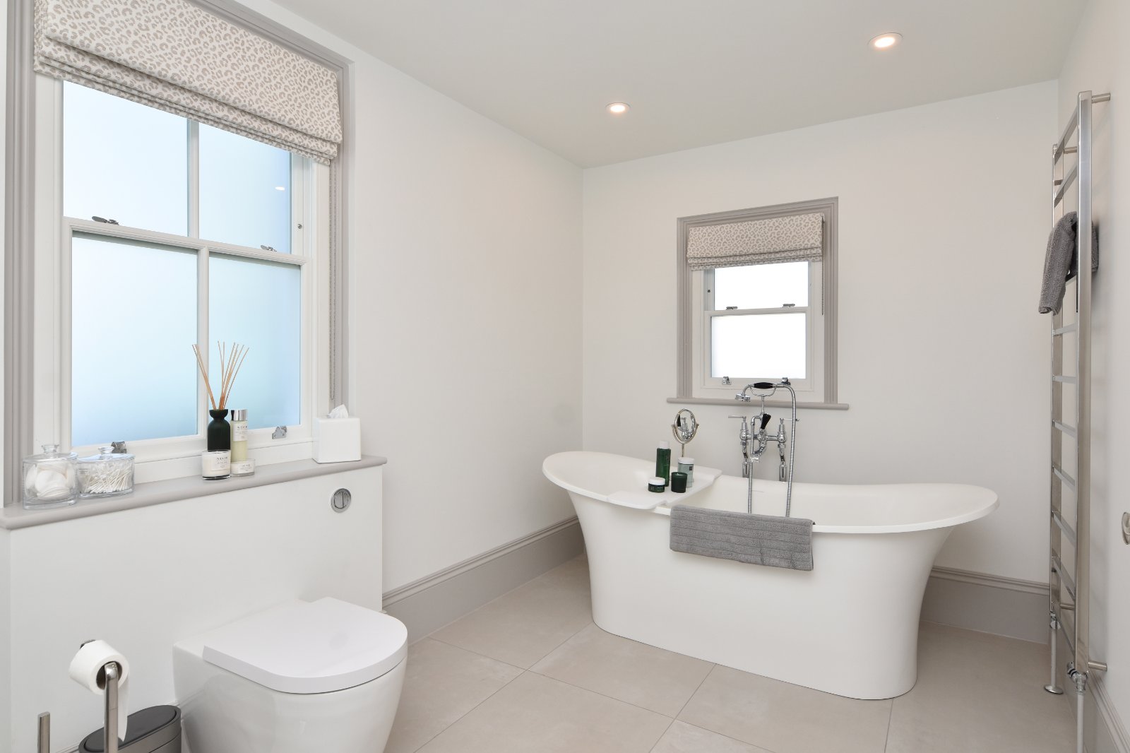 Pair of sash style uPVC, part obscure, double glazed windows to side and rear aspects. The Bathroom has been fitted with a bespoke range of sanitary-ware to include 'Heritage' ceramic vanity bar inset with pair of recessed sink units with mixer taps over, concealed cistern dual flush wc. Door to step-up shower enclosure with tiled flooring and drain away outlet, with integrated shower unit with wall mounted controls, oversize rain shower style shower head and additional hand held. The focal part of the room is a feature freestanding double end bath with floor mounted mixer tap with hand held shower attachment. Wall mounted ladder style heated towel rail. Feature porcelain tiling to walls and floor. Smooth plastered ceiling inset with recessed lighting.