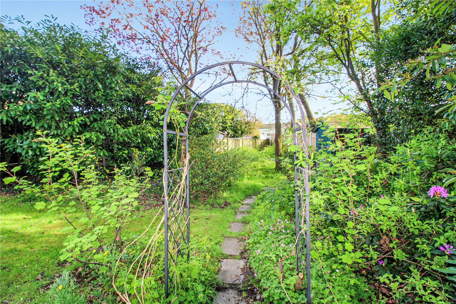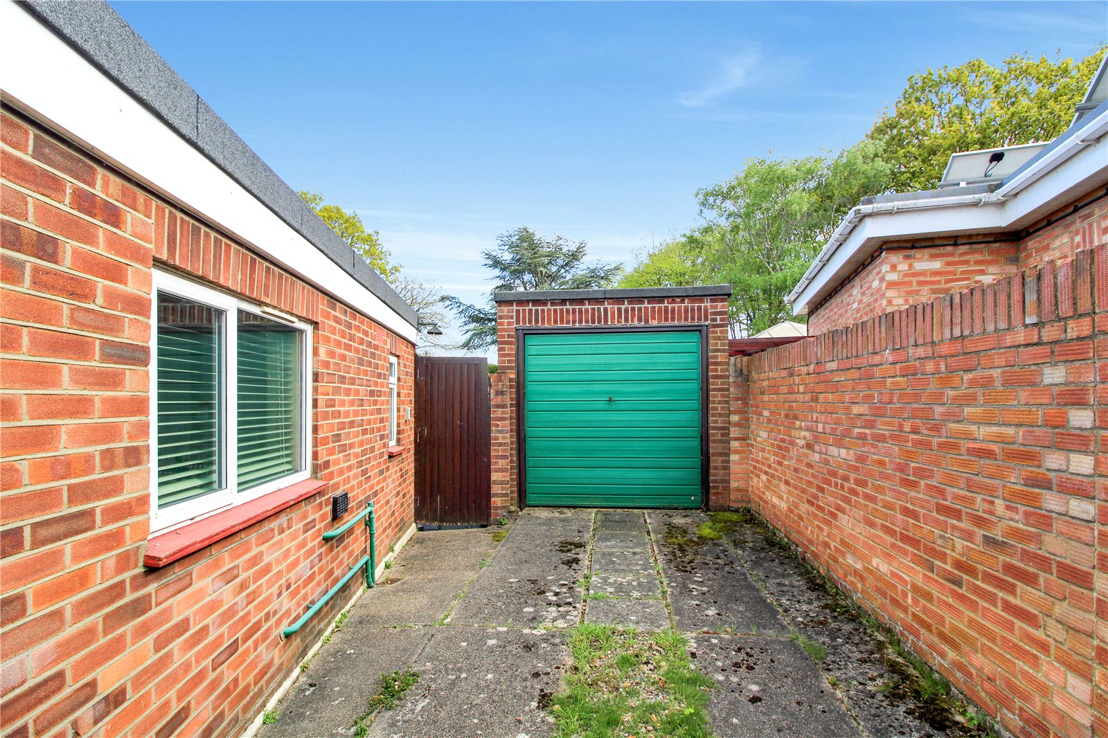 A crazy paved sweeping pathway leads to a solid oak door which gives access into the