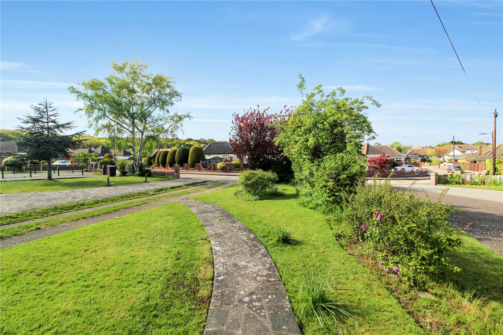 Low brick wall to the front boundary. Long driveway with parking for multiple vehicles leading to the garage. The front garden is predominantly laid to lawn with an array of trees and shrubs. Meter cupboard housing gas meter.