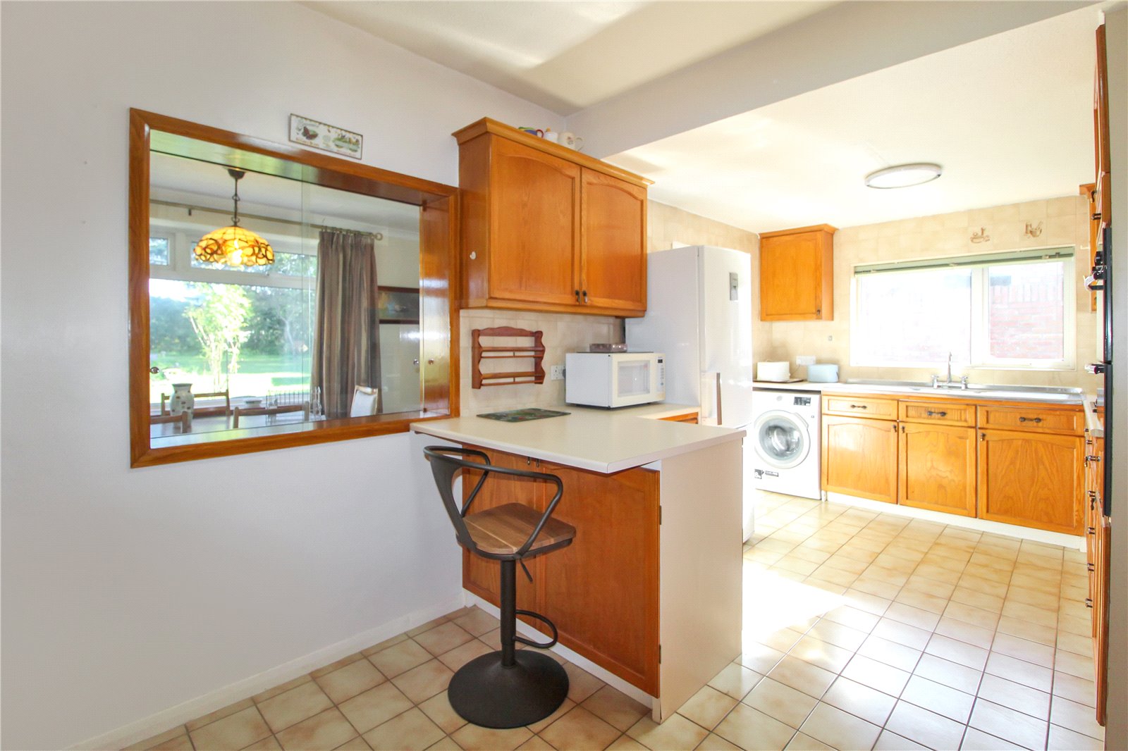 Tiled to floor. Skirting. Radiator. Large serving hatch into dining room. Smooth plastered walls. Extractor fan. Two ceiling lights. Door with inset five windowpanes to