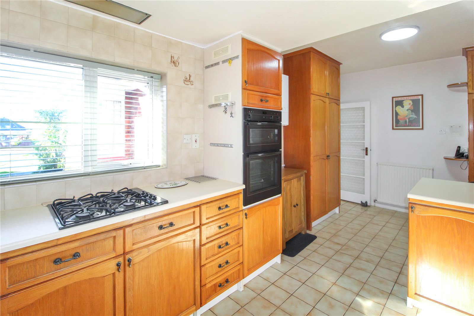 uPVC double glazed window to front and uPVC double glazed window to side. Fitted with rolled edge worksurface, inset stainless steel double drainer and sink unit with mixer tap, inset four ring gas hob and a range of base and eye level cabinets. Fitted with an additional worksurface doubled up as a breakfast bar with cupboards under. Tiling to worksurface areas. Two large storage cupboards with cupboards above. Additional wall-mounted cupboard housing oven. Wall-mounted 'Ideal' central heating boiler.