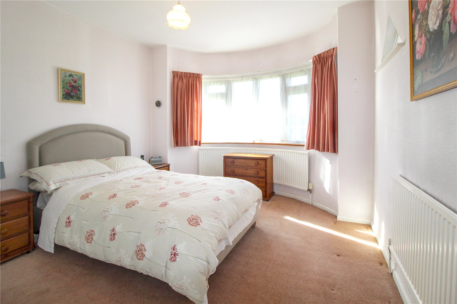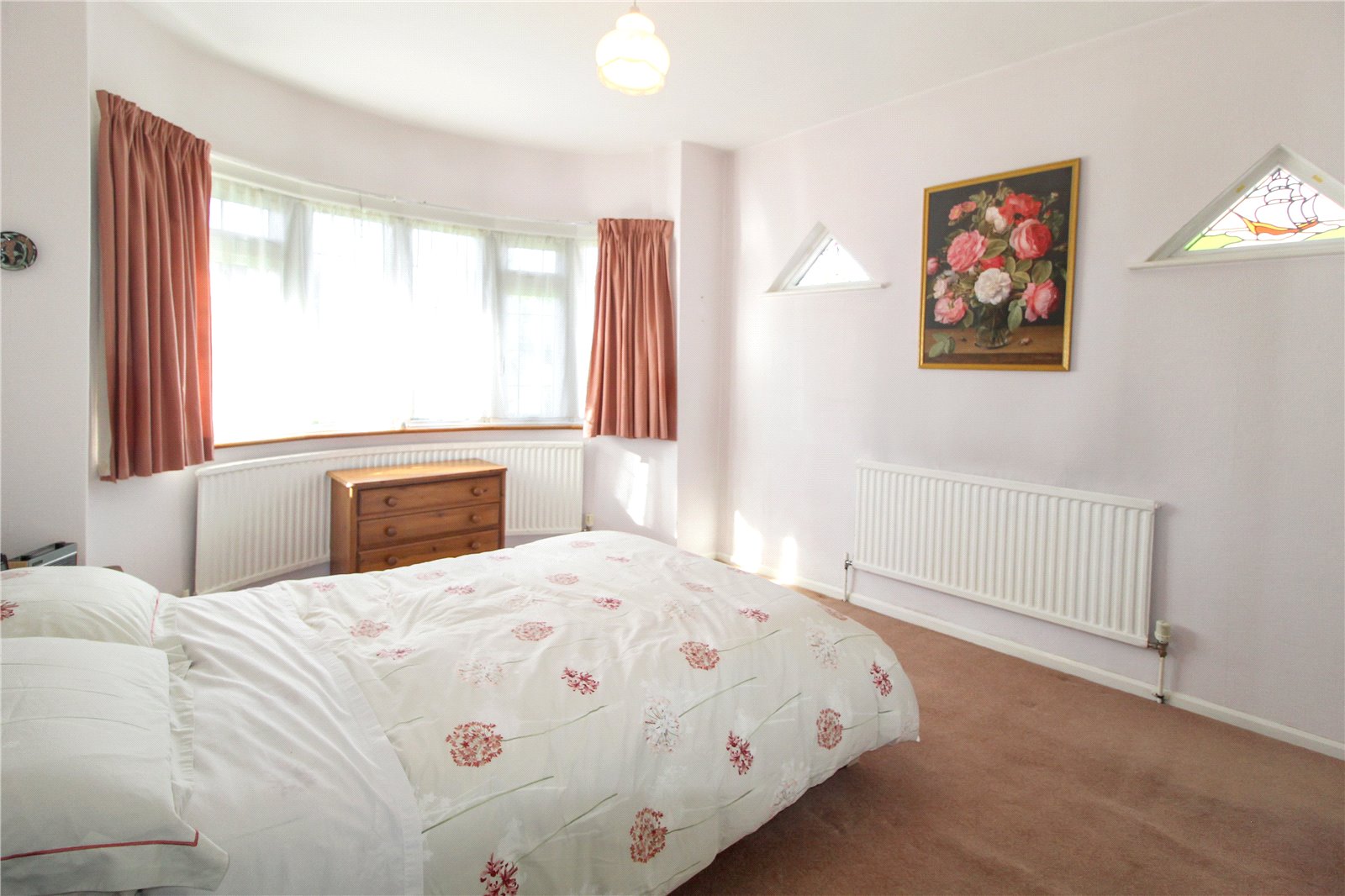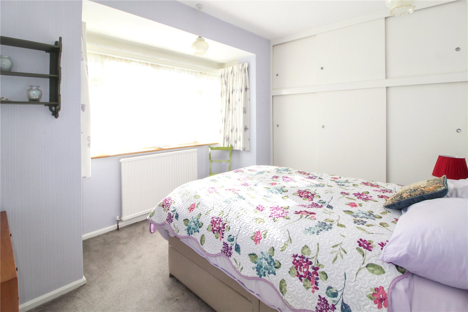 Carpet to floor. Skirting. Double banked radiator. Triple built-in wardrobes with sliding doors. Two ceiling lights.