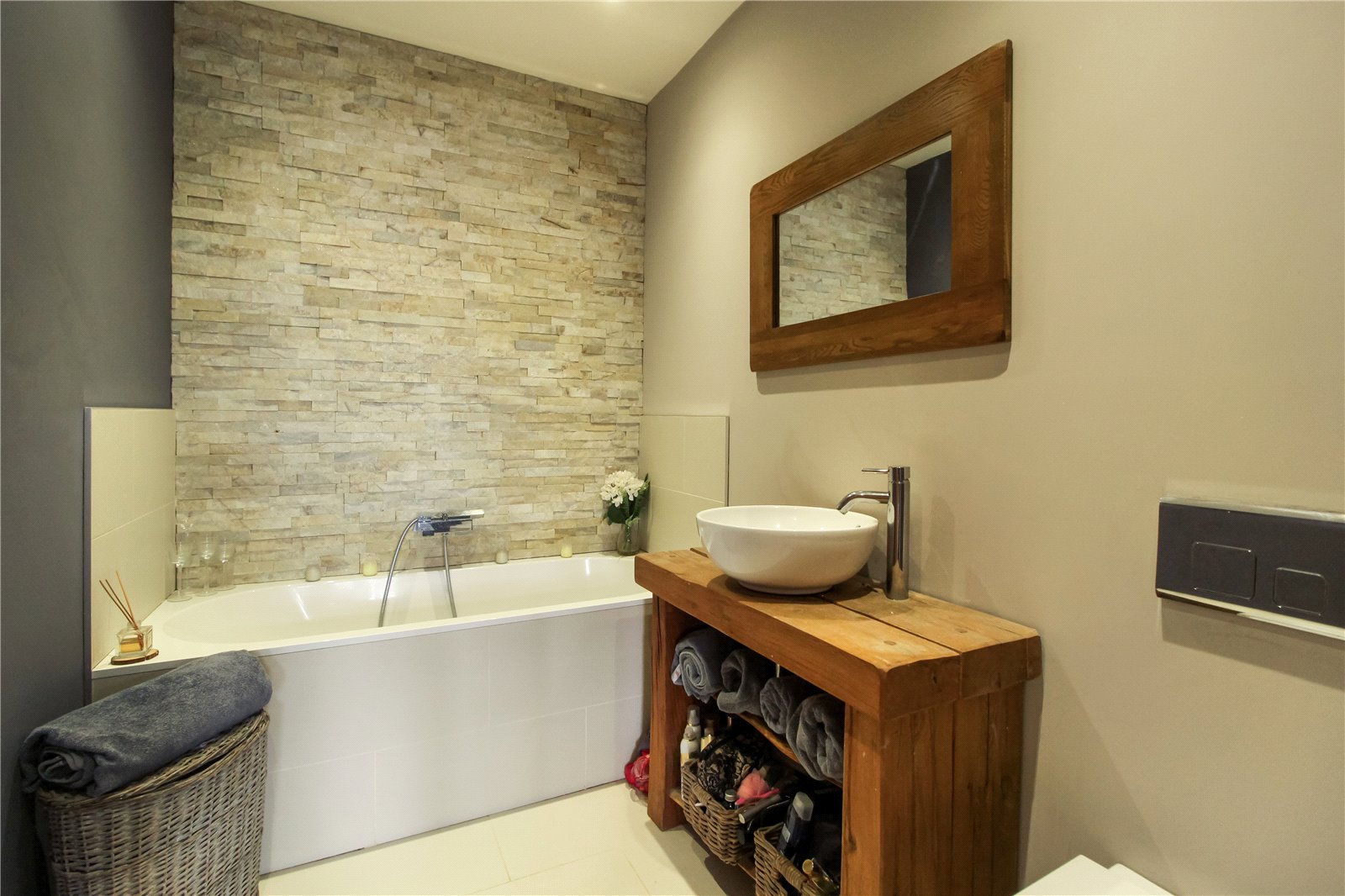Modern three-piece suite comprising of panel enclosed bath with chrome mixer tap and shower attachment, wash hand basin with chrome mixer tap, low level WC. Tiles to floor with underfloor heating, smooth plastered walls and ceiling, completed with fitted spotlighting.