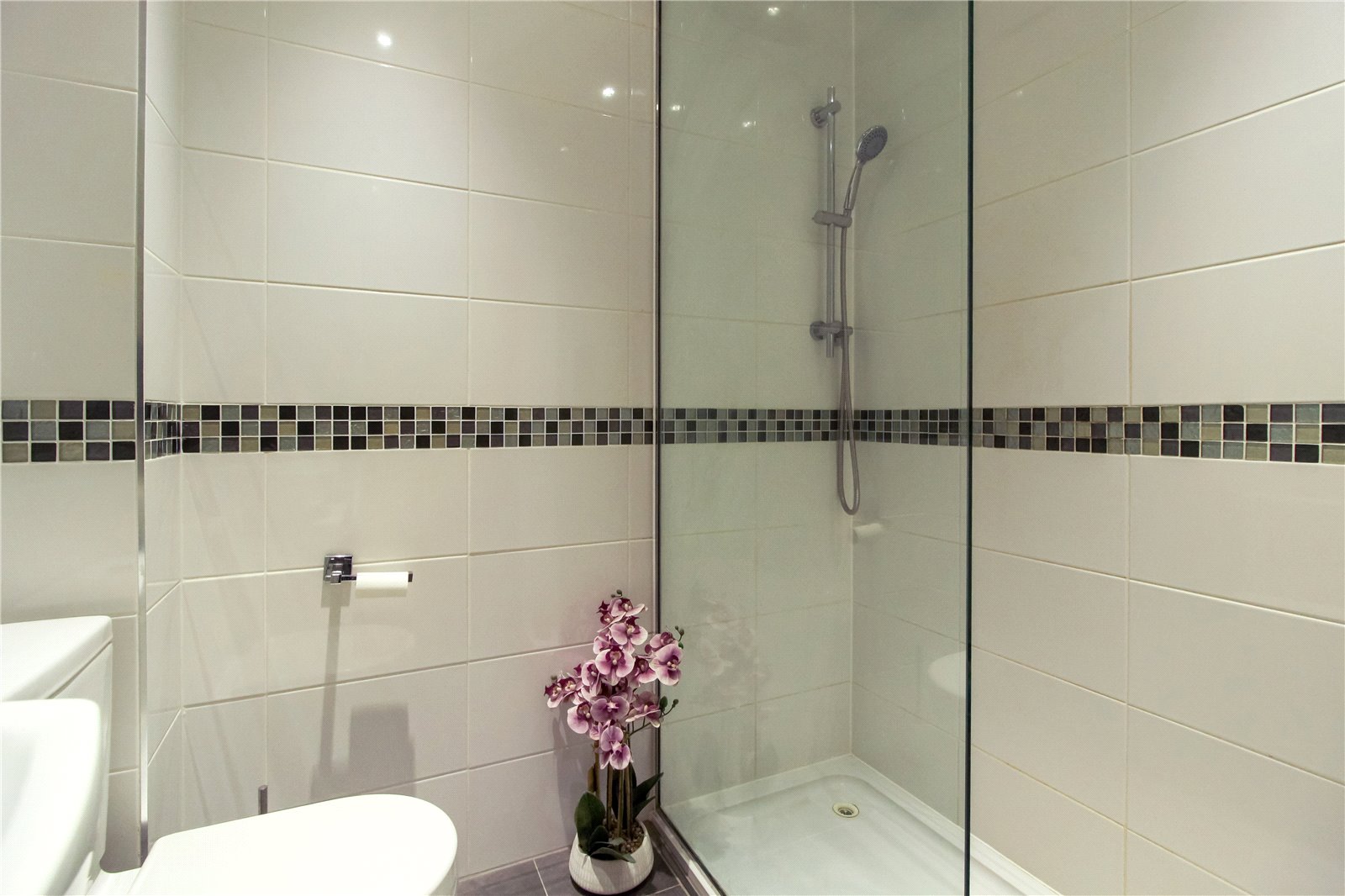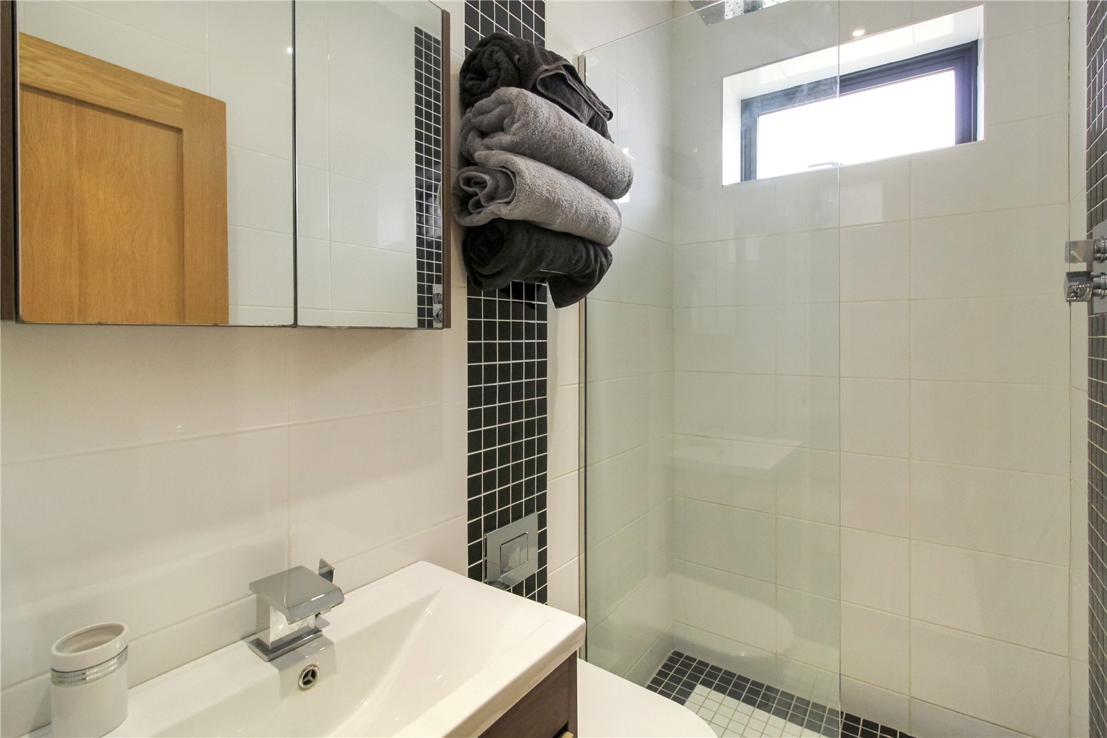 Modern three-piece shower room suite, comprising of fully tiled walk-in shower cubicle, low level WC, wash hand basin with chrome mixer tap. Tiled flooring with underfloor heating, and tiles to all surrounding walls. Smooth plastered ceiling with fitted spotlighting.