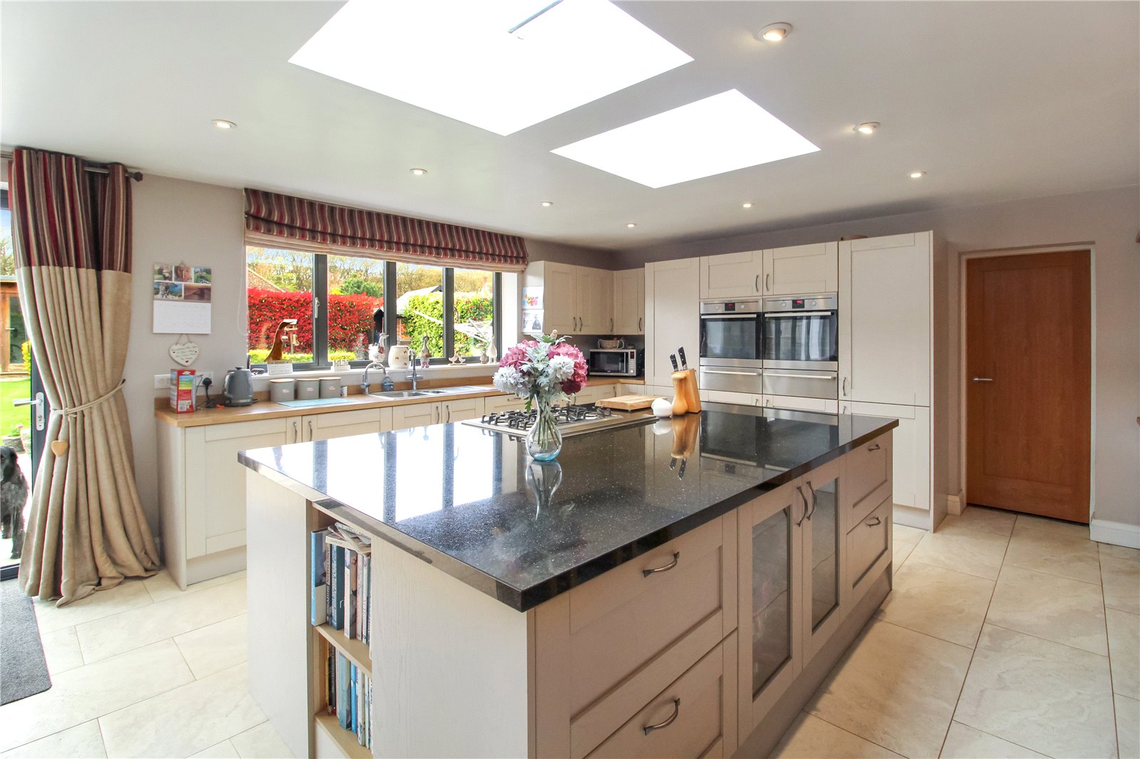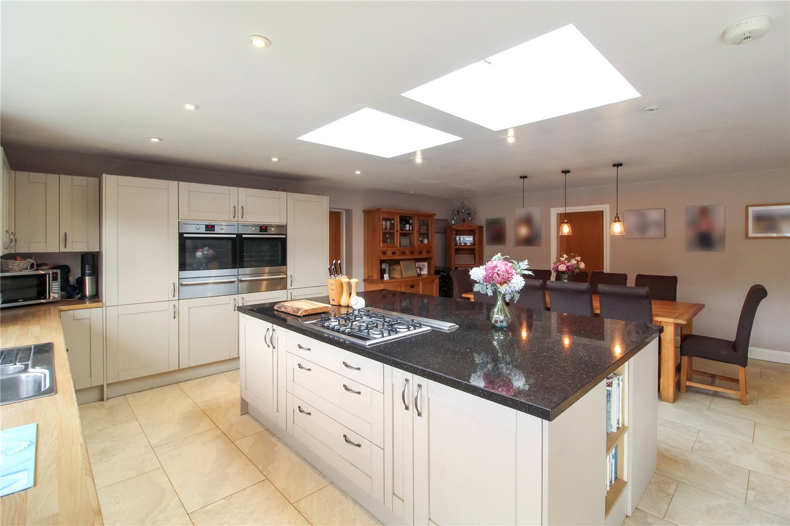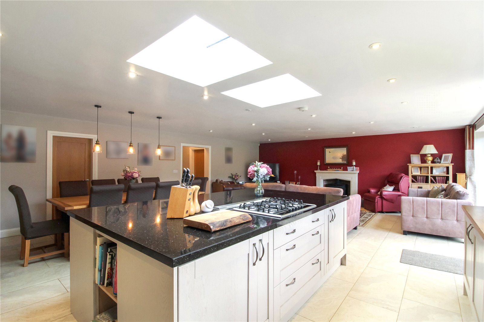 The Kitchen features a modern range of eye and base level units with integrated stainless steel sink with chrome mixer tap and drainer, two built in ovens, full height fridge, and dishwasher. Central island with granite worktop with matching cupboards and drawers beneath and integrated five ring gas hob with extractor hood.