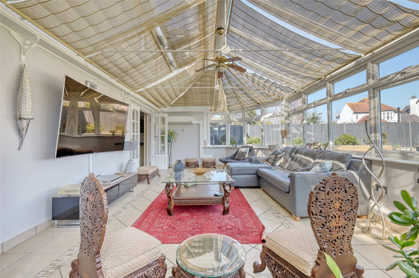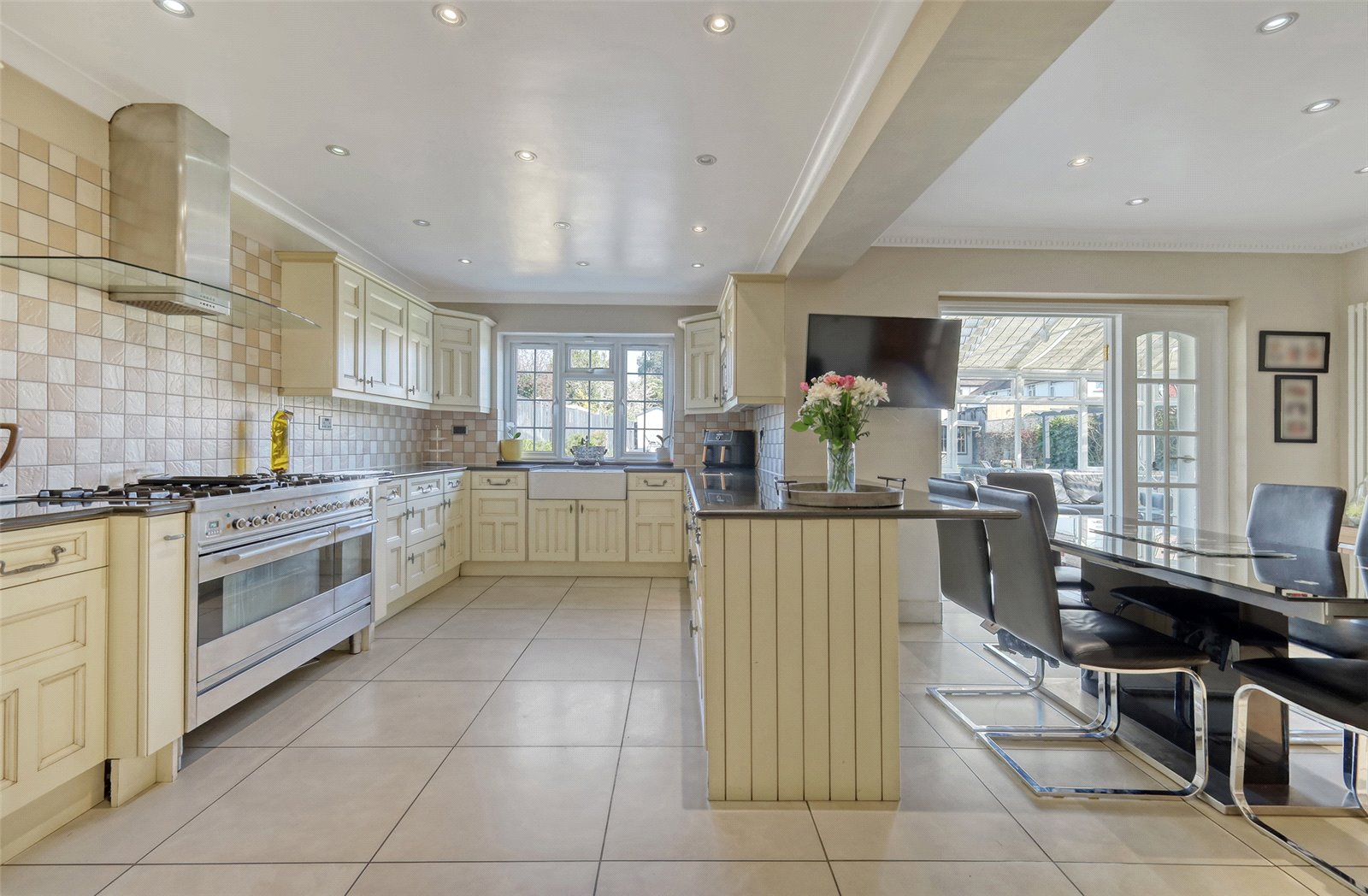 This large double glazed conservatory has a glazed vaulted ceiling. Windows and French double doors framing lovely views across the rear garden. Tiled floor with underfloor heating. Air conditioning unit. Glazed double doors and side screens leading to: